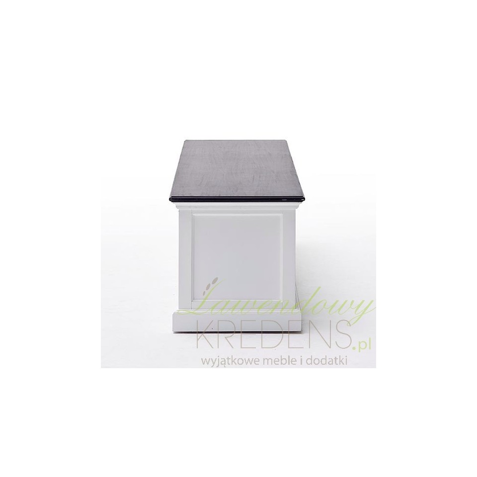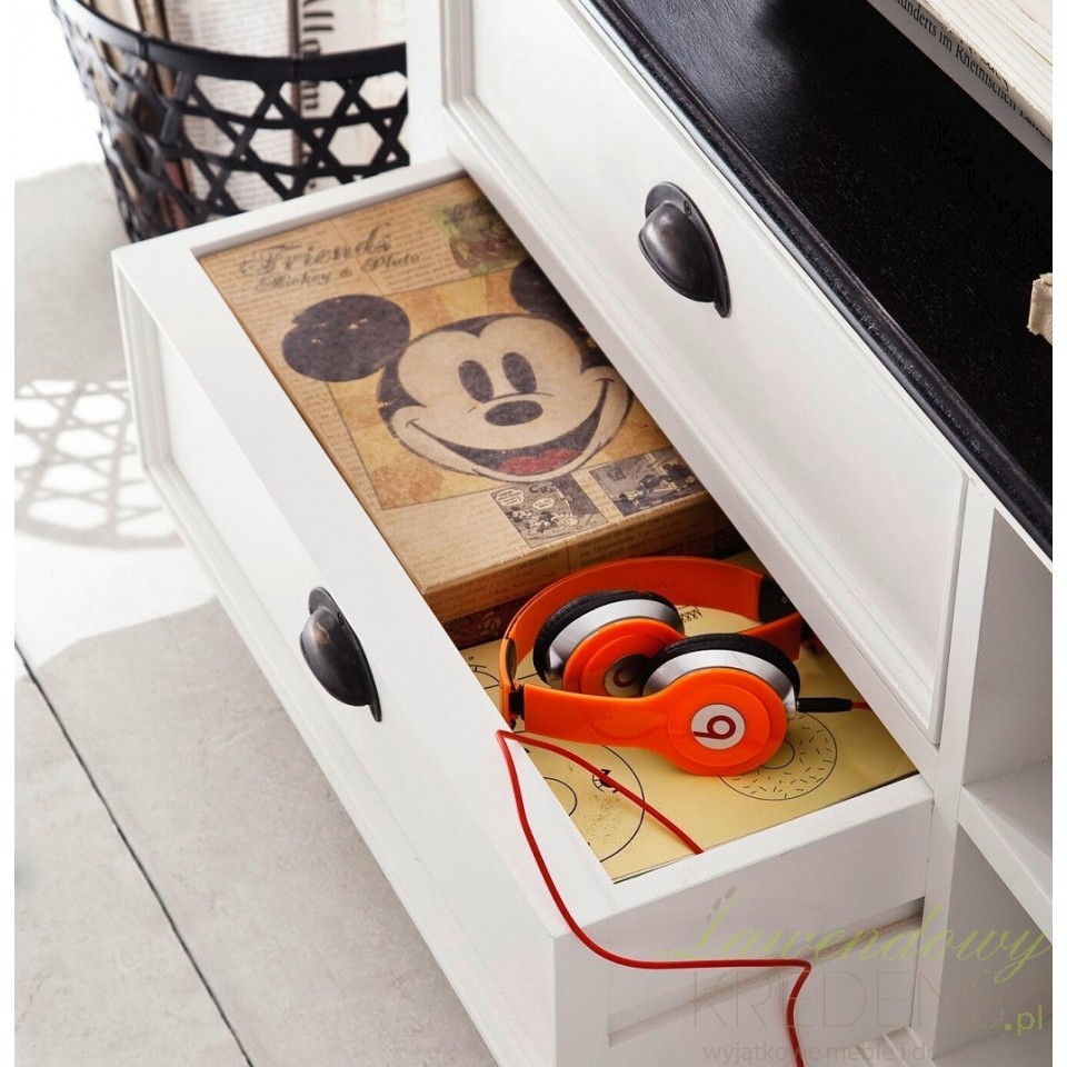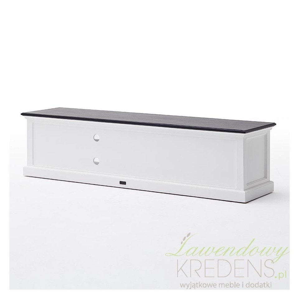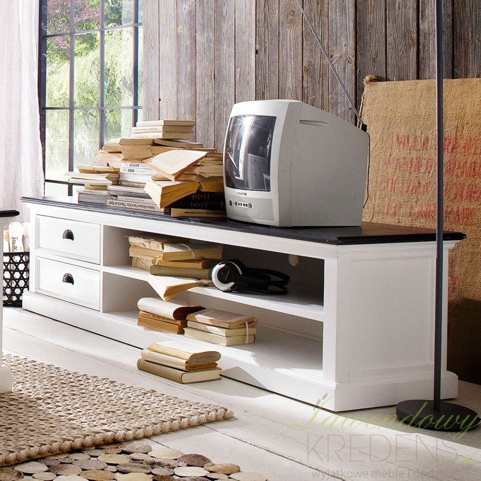 Meble prowansalskie do salonu to między innymi komoda RTV prowansalska z eleganckim, czarnym blatem. Mebel wykonano z drewna.