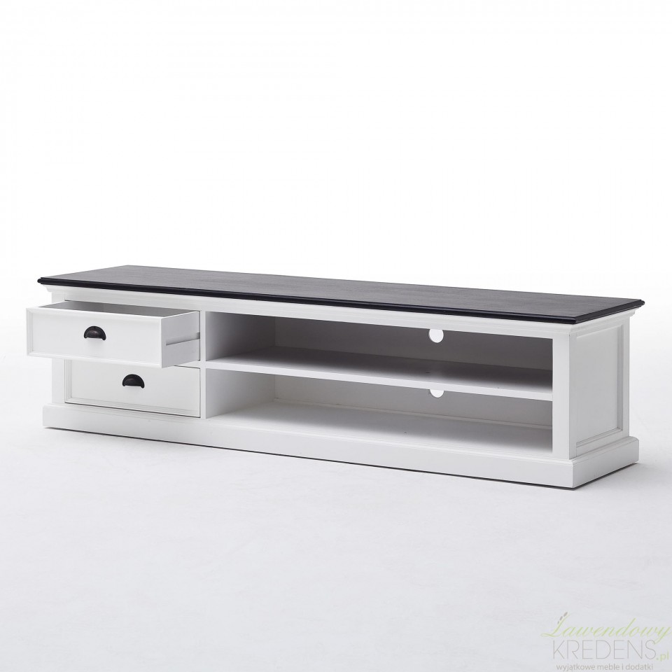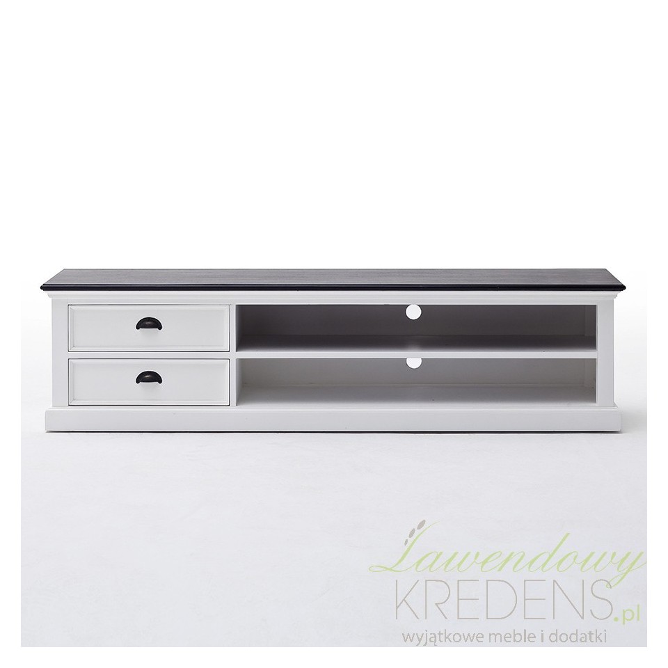 Tradycyjna komoda RTV w stylu prowansalskim wykonana z drewna i wykończona czarnym blatem. To, co szczególnie podoba nam się w tej komodzie, to dużo miejsca do przechowywania - dwie szufladki oraz dwie podłużne półki! Biała komoda RTV prowansalska będzie atrakcyjnie prezentowała się w każdym salonie. Pozostałe meble prowansalskie z kolekcji Lumi znajdziesz w naszym sklepie!