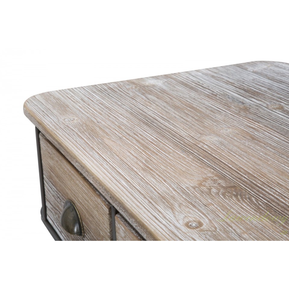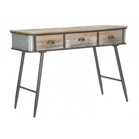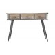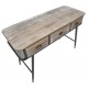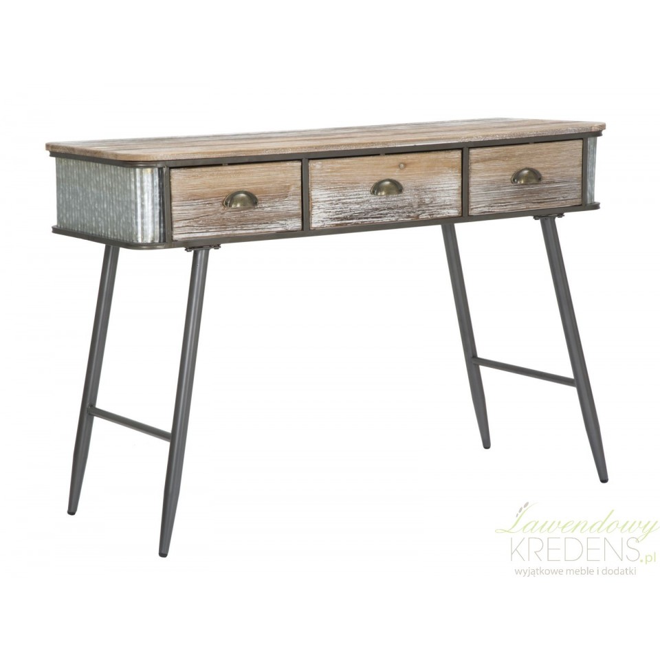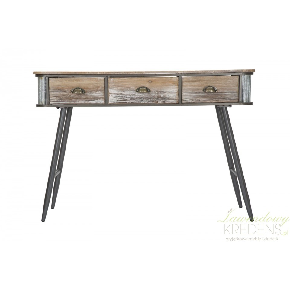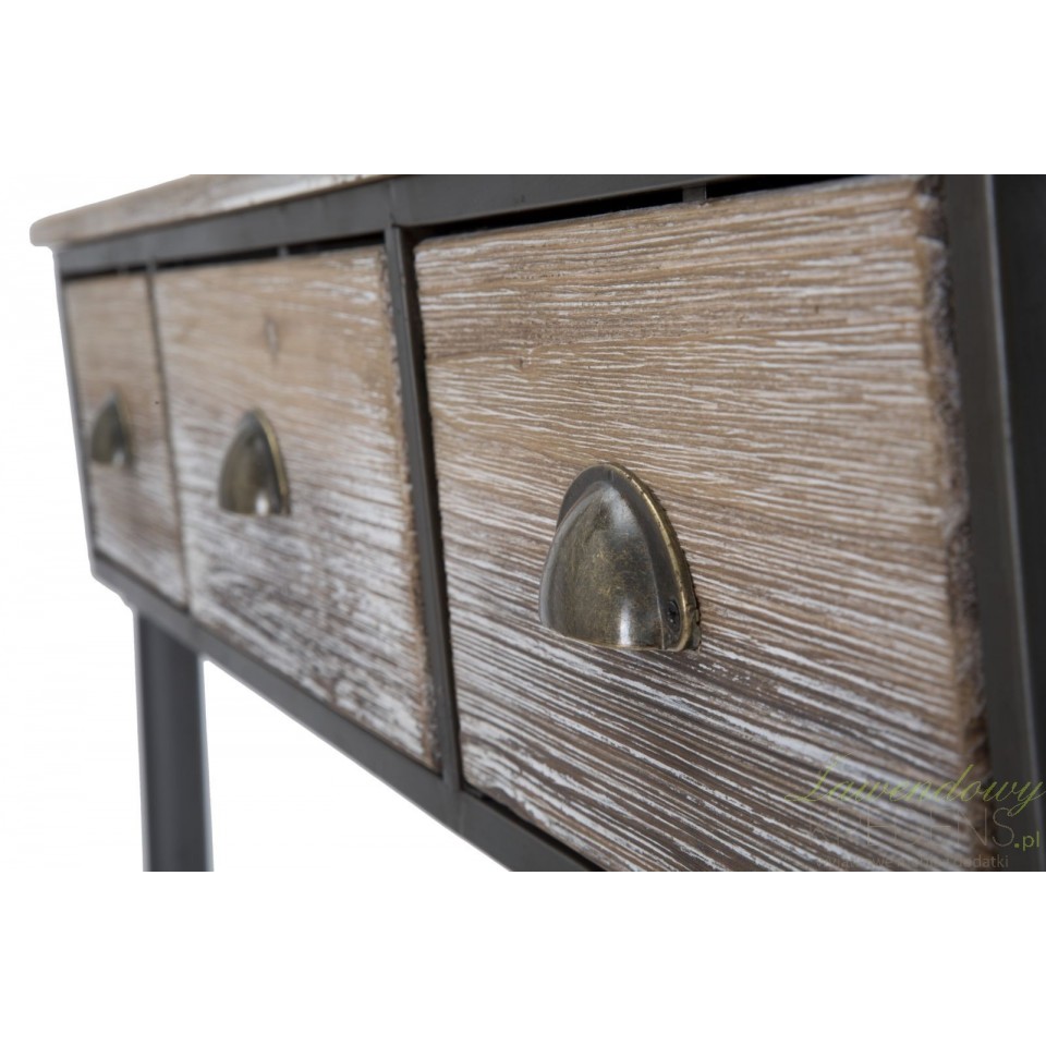 Drewniana konsola industrialna z metalowymi elementami wyposażona jest w trzy szufladki. Ten mebel pomoże Ci lepiej zorganizować przedpokój lub salon.