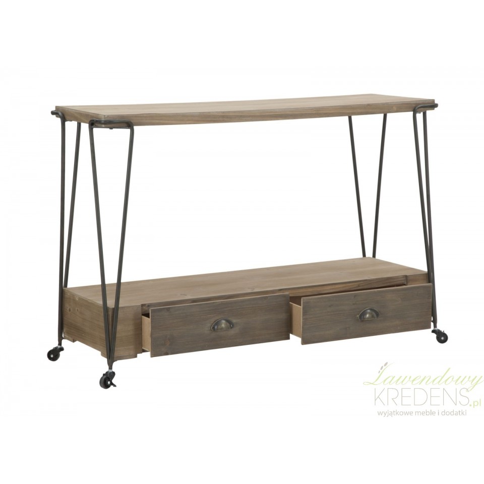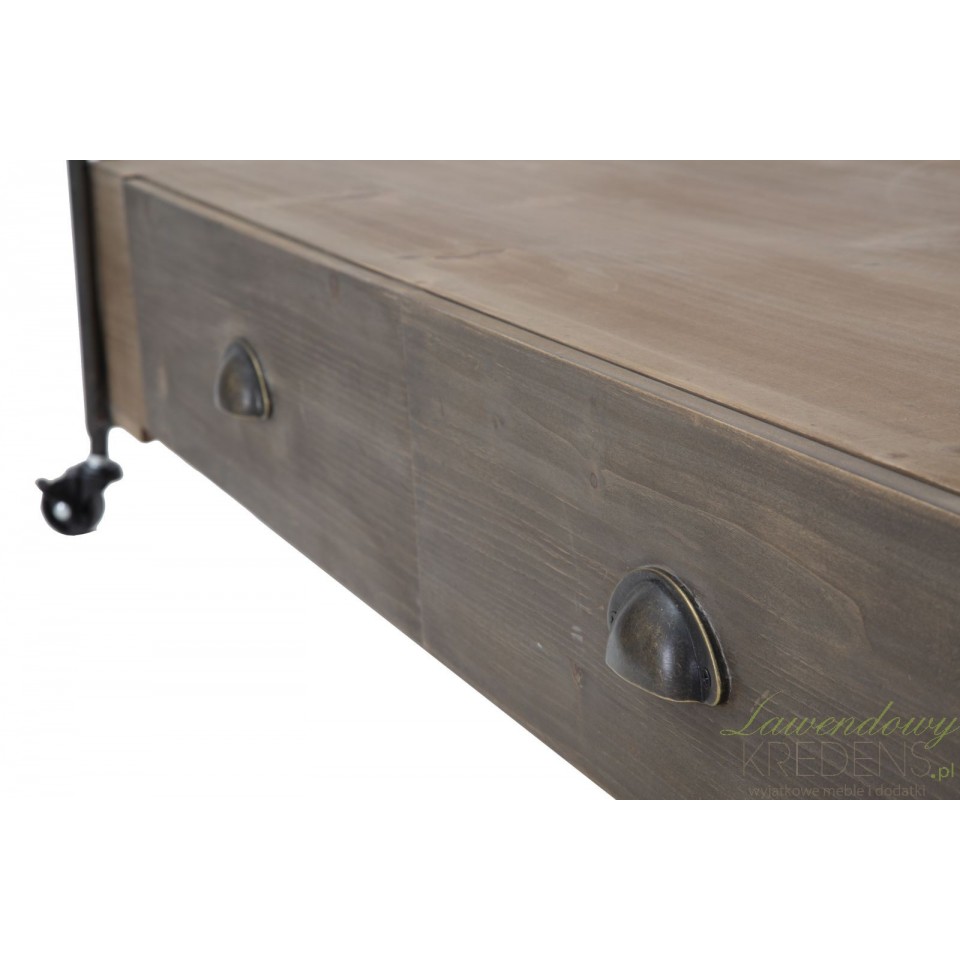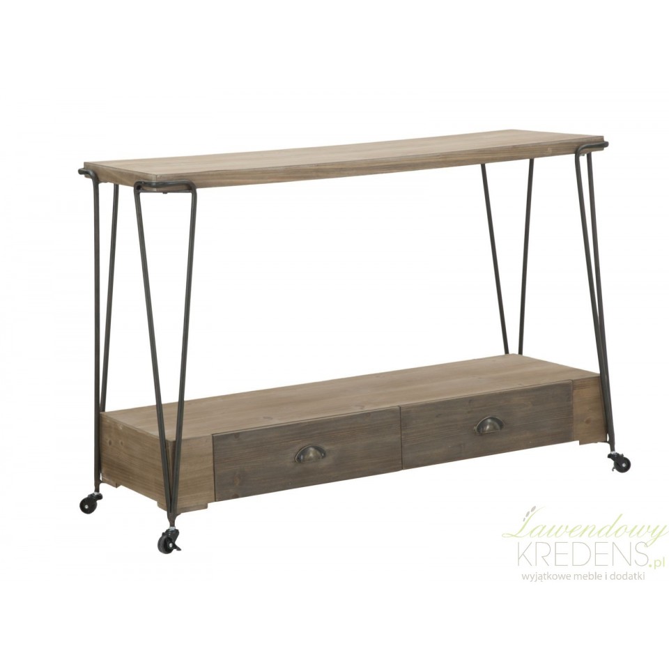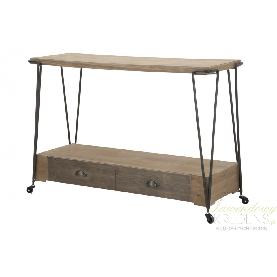 Loftowa konsola na kółkach najlepiej sprawdzi się jako mebel przyścienny, na którym można wyeksponować ciekawe dekorację. Szuflady znajdujące się w dolnej części mebla nie tylko dodają konsoli praktyczności, ale także spełniają swoją dekoracyjną funkcję. Konsola loftowa doskonale nadaje się do przechowywania bibelotów, książek i innych dodatków. Niezwykle efektowny wygląd zapewniają jej smukłe nogi metalowe i cztery kółka.