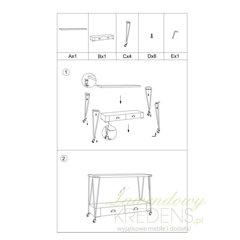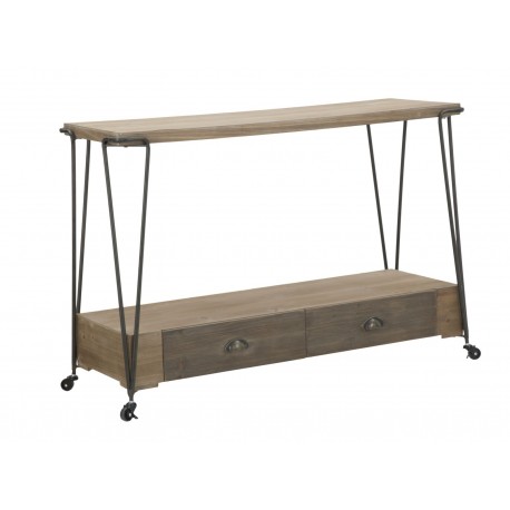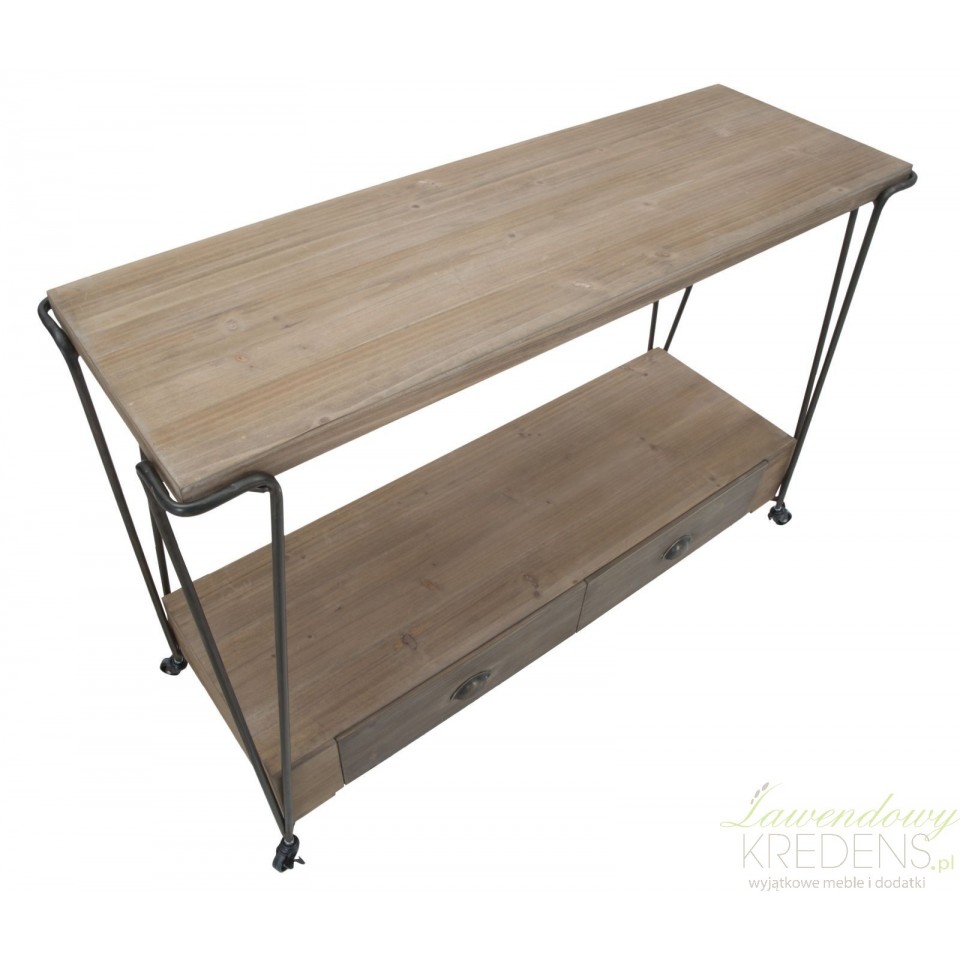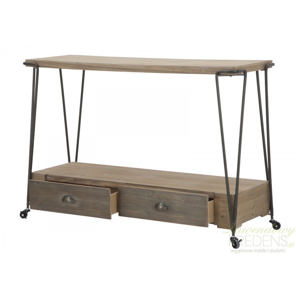 Loftowa konsola na kółkach najlepiej sprawdzi się jako mebel przyścienny, na którym można wyeksponować ciekawe dekorację. Szuflady znajdujące się w dolnej części mebla nie tylko dodają konsoli praktyczności, ale także spełniają swoją dekoracyjną funkcję. Konsola loftowa doskonale nadaje się do przechowywania bibelotów, książek i innych dodatków. Niezwykle efektowny wygląd zapewniają jej smukłe nogi metalowe i cztery kółka.