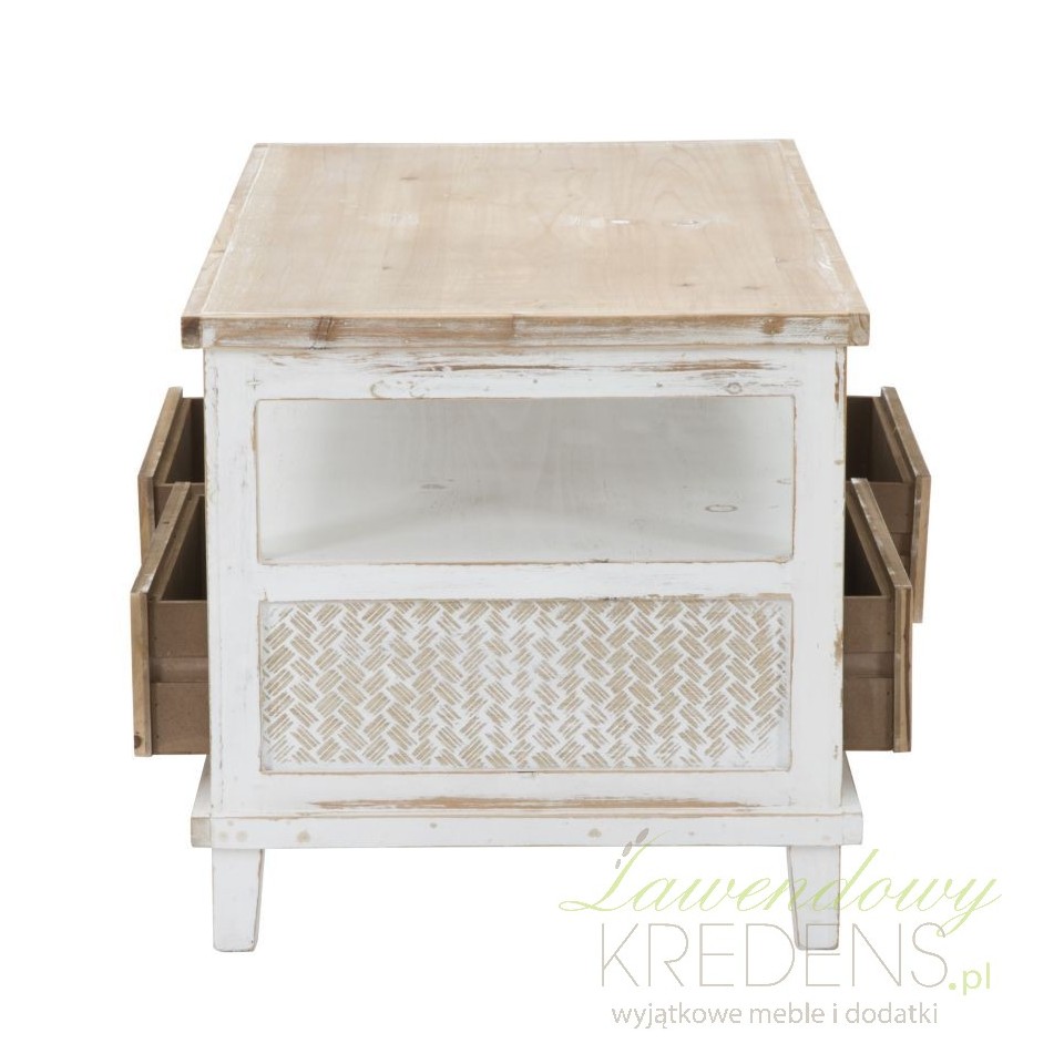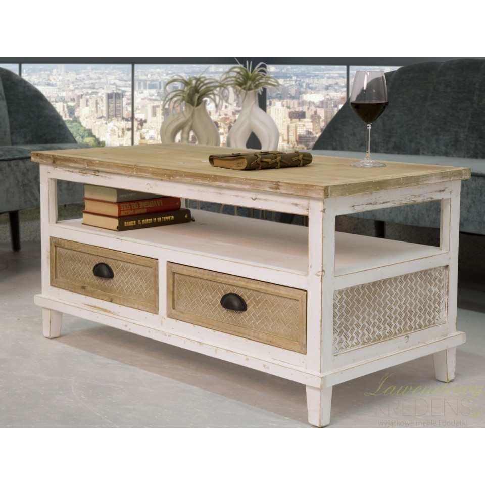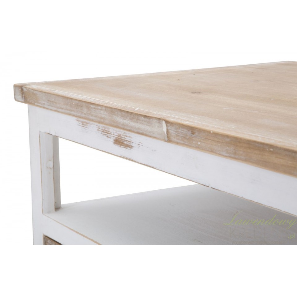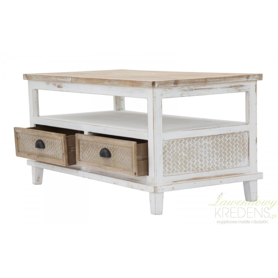 Stół kawowy Marrakech jest utrzymany w naturalnej, jasnej, biało-brązowej kolorystyce. W prowansalskim salonie to właśnie ten mebel będzie głównym elementem dekoracyjnym, dlatego zalecamy ustawić go naprzeciwko sofy lub pomiędzy fotelami, by goście i domownicy mieli do niego swobodny dostęp. Wyjątkowy styl meblowi nadaje drobna faktura na szufladkach i widoczne przecierki. Stolik kawowy z miejscem do przechowywania to mebel perfekcyjny!