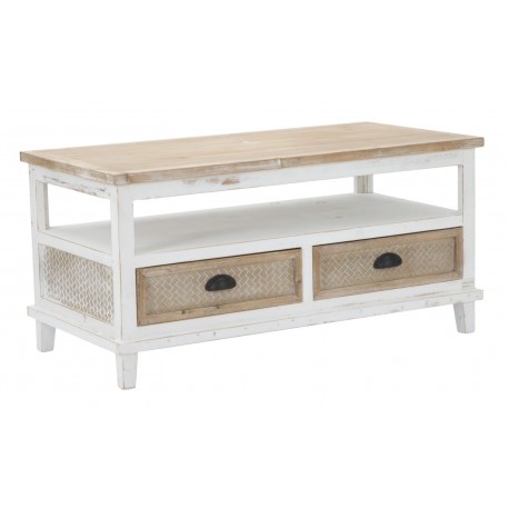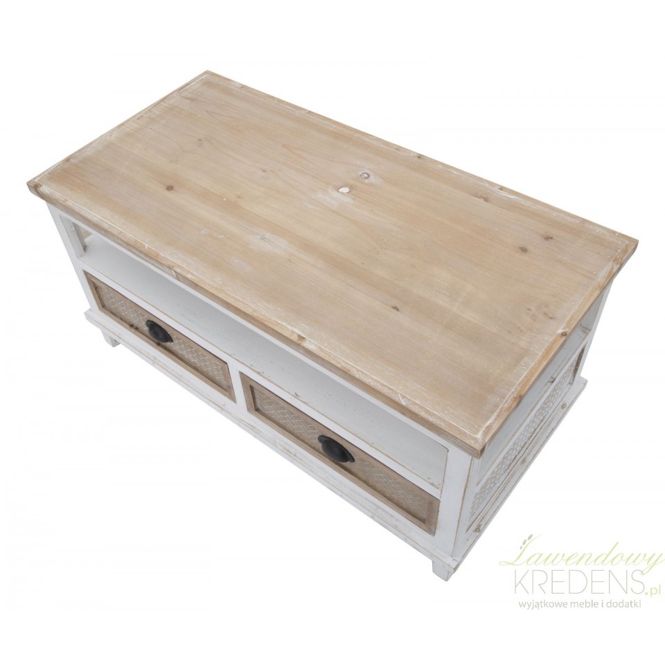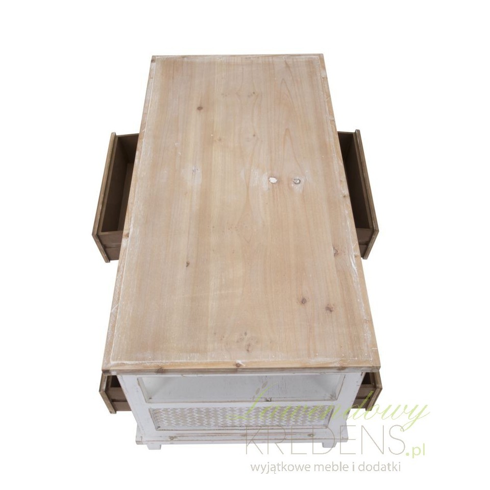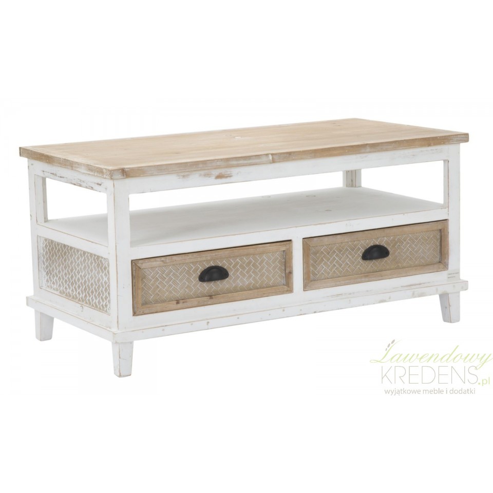 Stół kawowy Marrakech jest utrzymany w naturalnej, jasnej, biało-brązowej kolorystyce. W prowansalskim salonie to właśnie ten mebel będzie głównym elementem dekoracyjnym, dlatego zalecamy ustawić go naprzeciwko sofy lub pomiędzy fotelami, by goście i domownicy mieli do niego swobodny dostęp. Wyjątkowy styl meblowi nadaje drobna faktura na szufladkach i widoczne przecierki. Stolik kawowy z miejscem do przechowywania to mebel perfekcyjny!