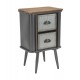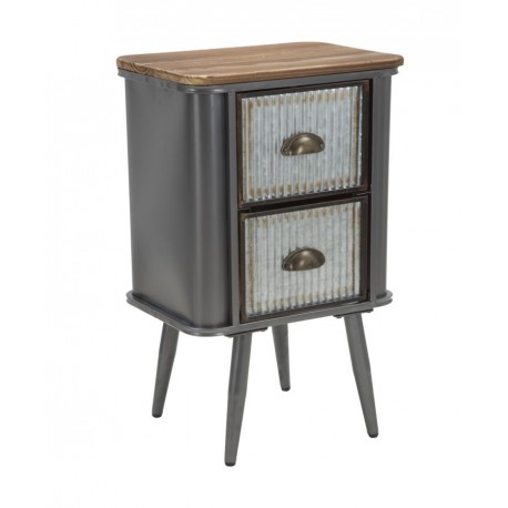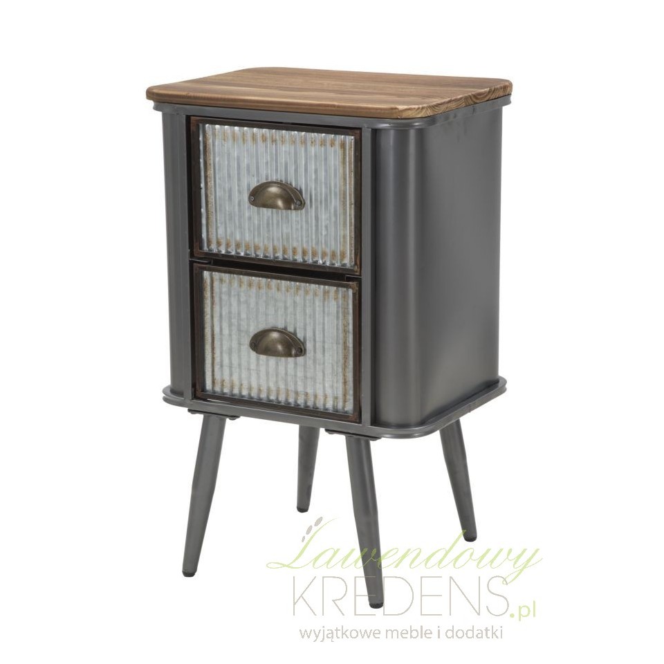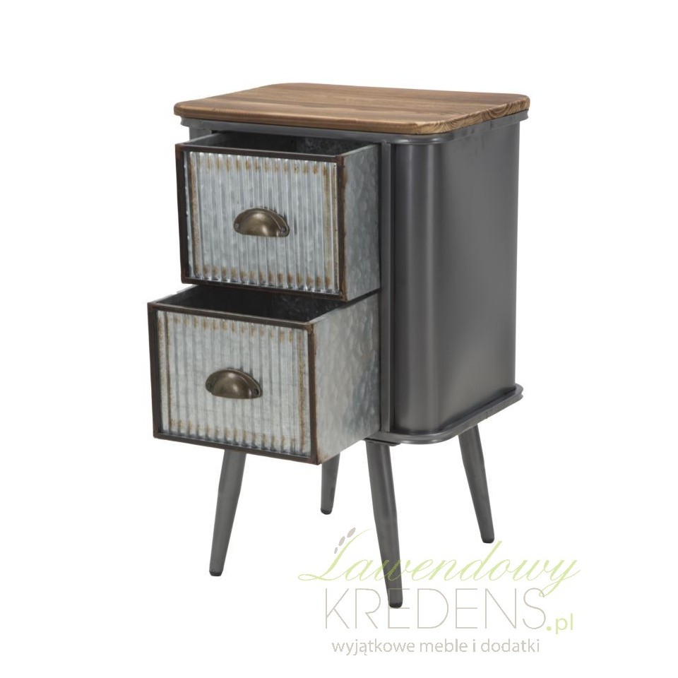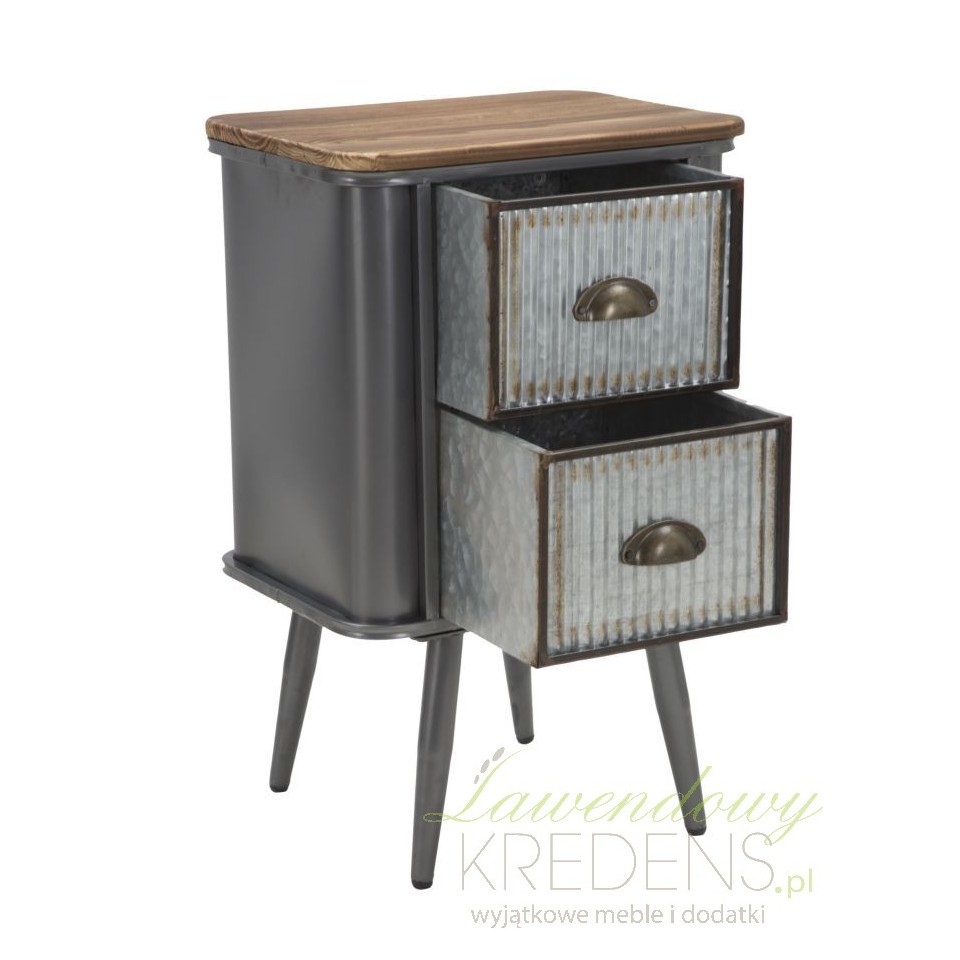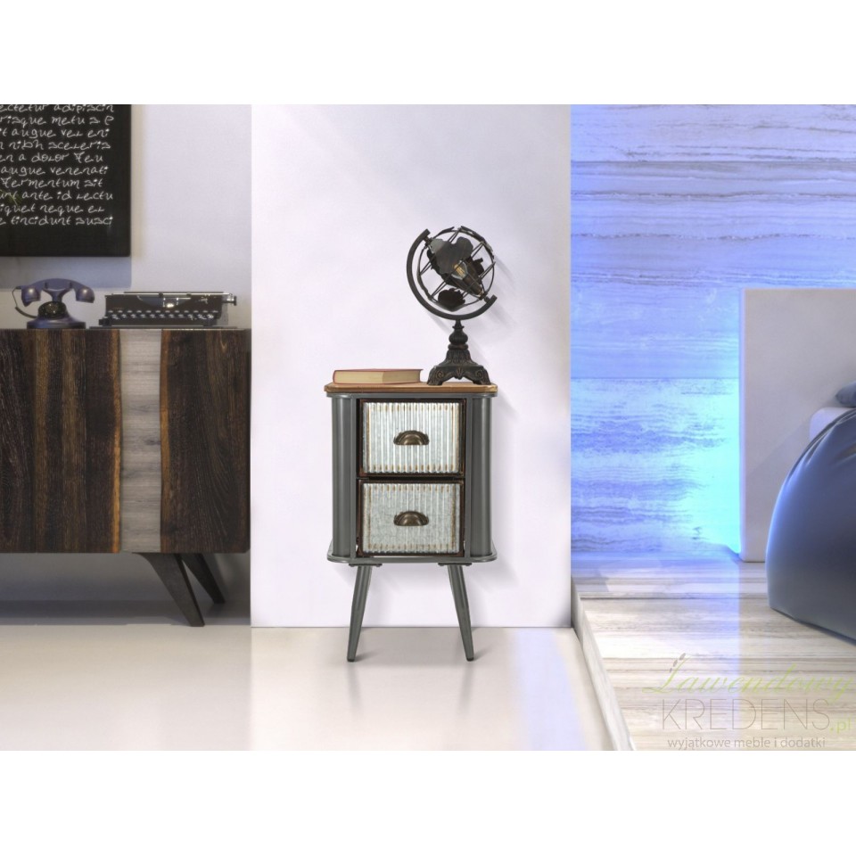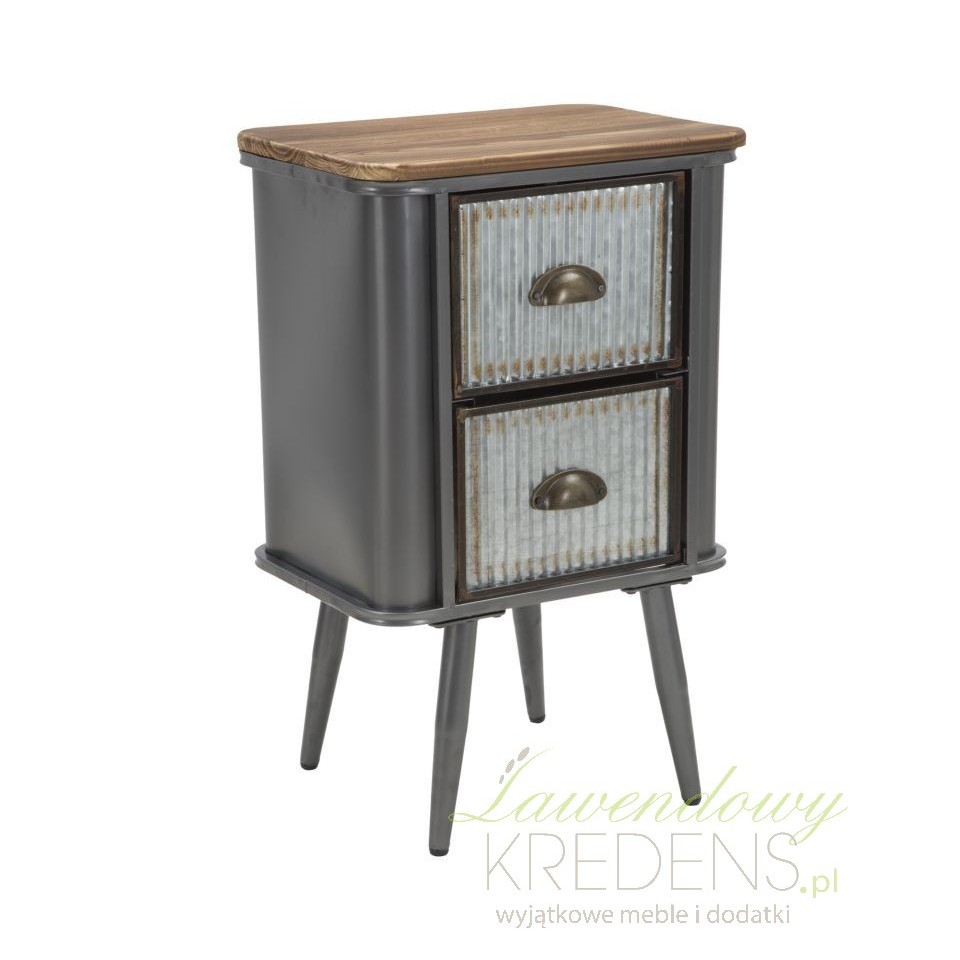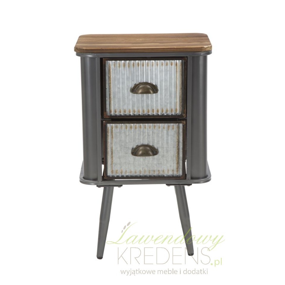 Metalowe meble w stylu industrialnym z nutą stylu vintage znajdziesz w kolekcji Illinois. Doskonałym przykładem jest prezentowana szafka nocna, która posiada dwie szuflady o prążkowanej fakturze oraz poręczne, półokrągłe uchywty. Osadzona stabilnie na czterech prostych nogach i okryta drewnianym blatem spełni swoją rolę w każdej sypialni loftowej i industrialnej. Nie ma żadnych preciwskazań aby industrialne meble tego typu wykorzystać w przedpokoju lub gabinecie.