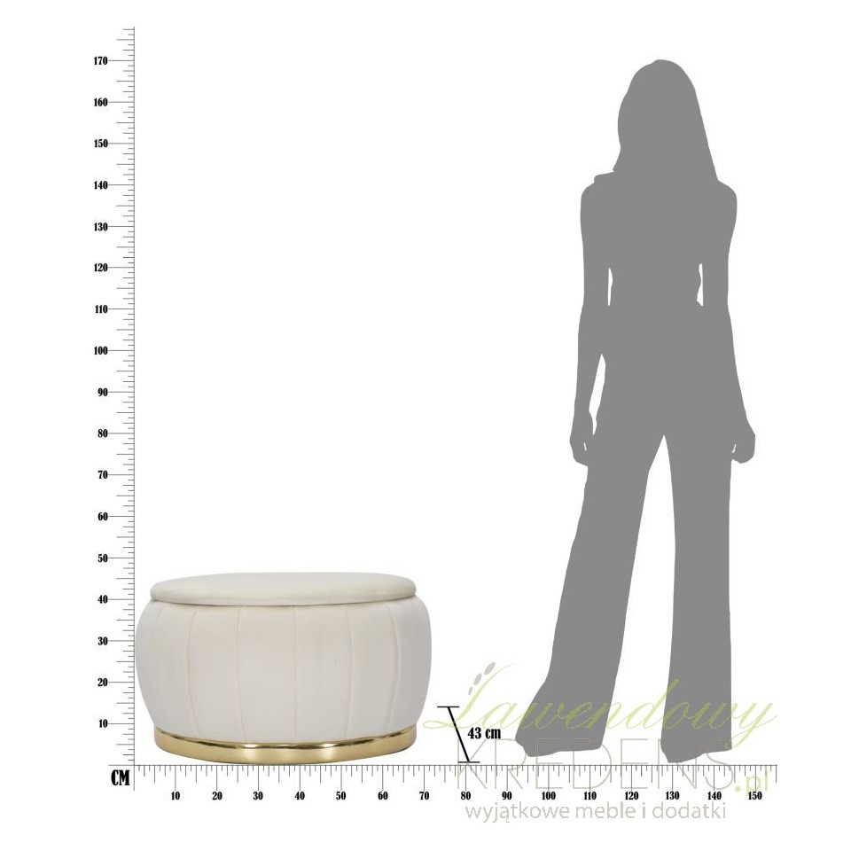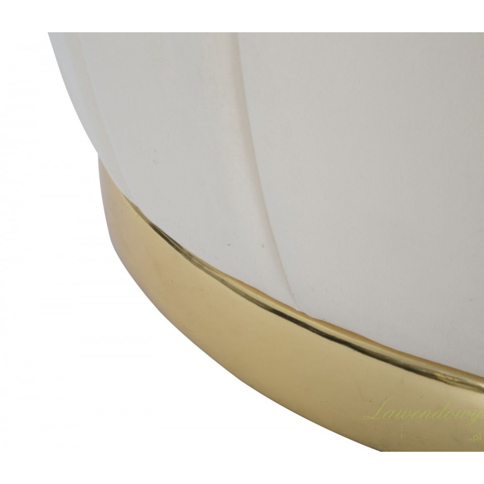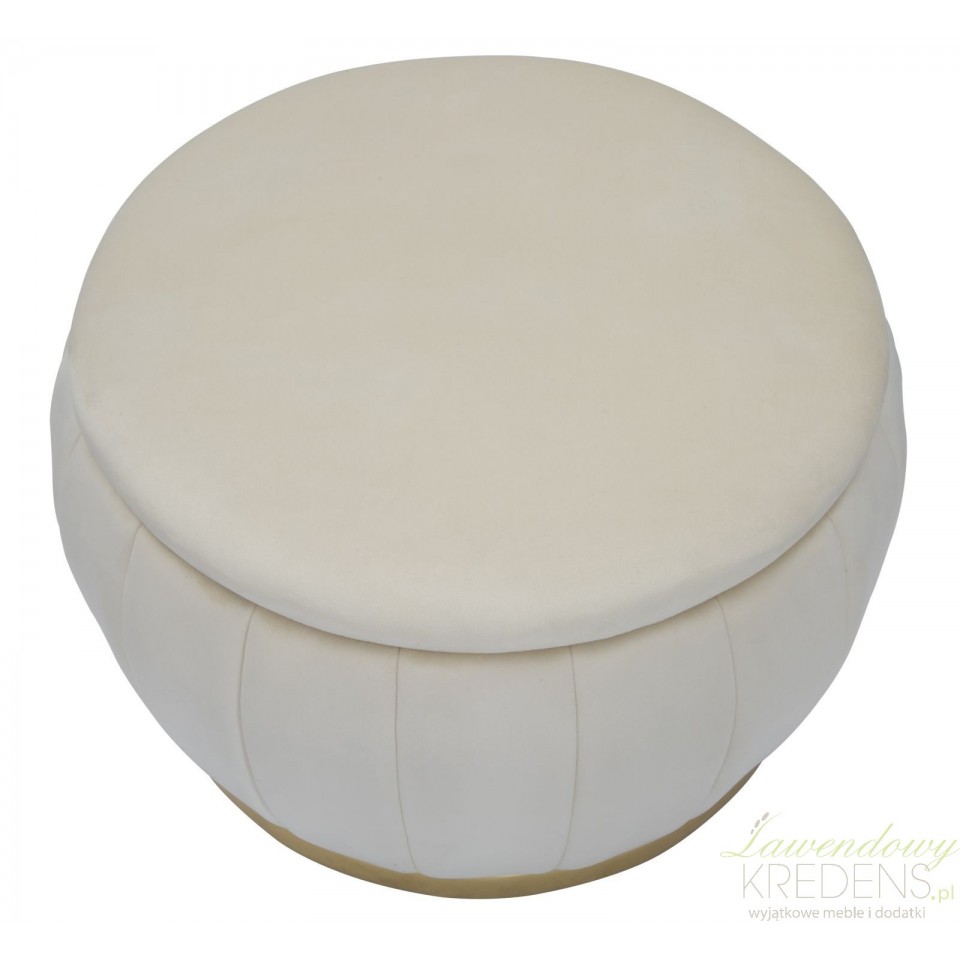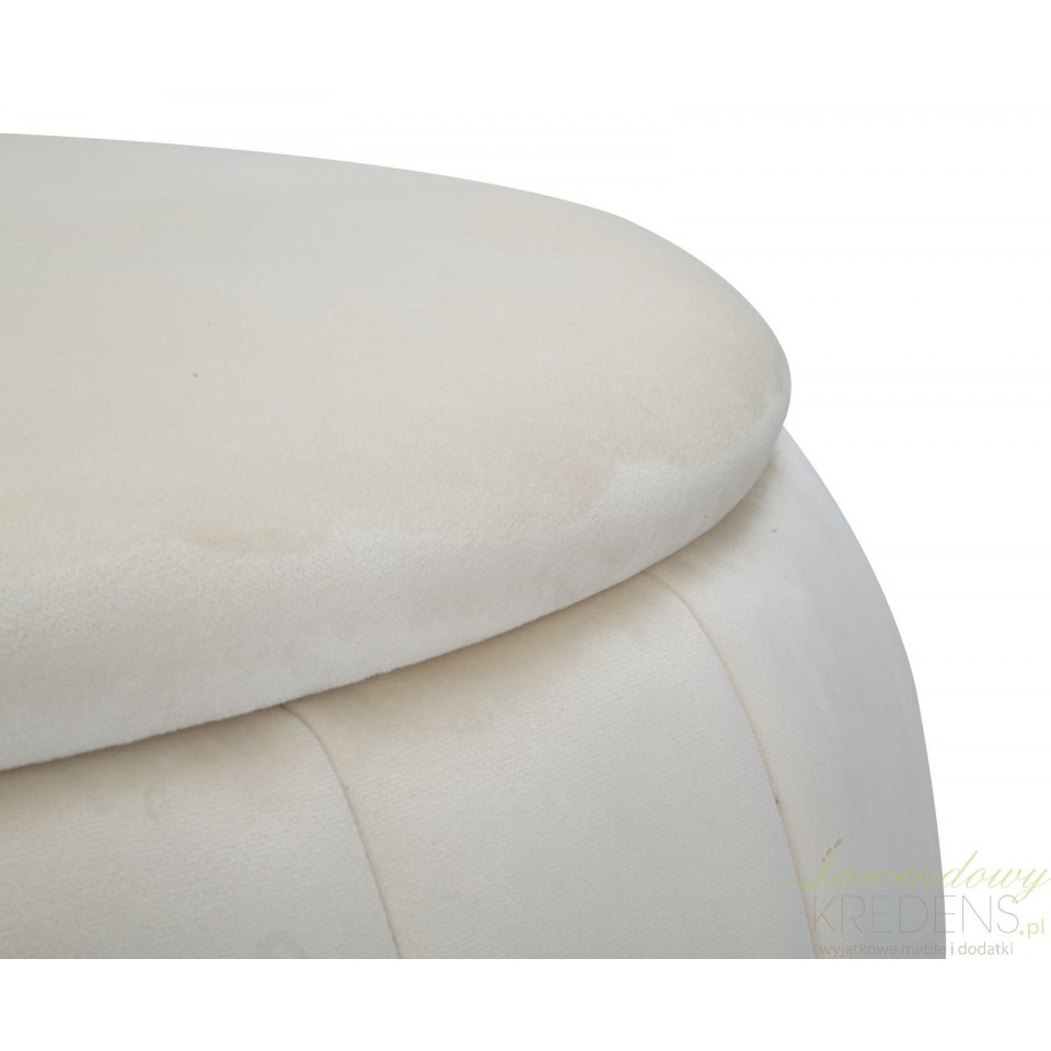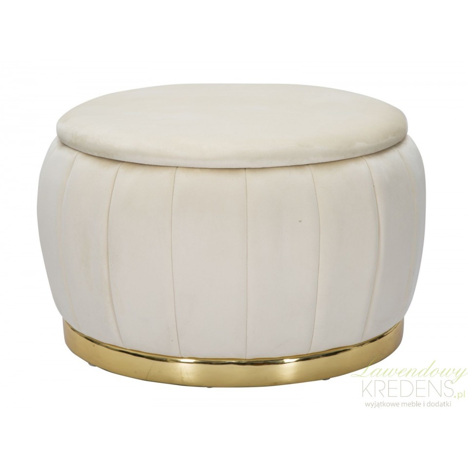 Tapicerowana pufa glamour z pionowymi przeszyciami wokół ma kremowy kolor. Konstrukcja mebla wykonana została z metalu, uwzględniając pojemny schowek w swoim wnętrzu. Marzysz o przyjemnym i praktycznym salonie? Pufa ze schowkiem doskonale sprawdzi się w nim jako dodatkowe siedzisko!
