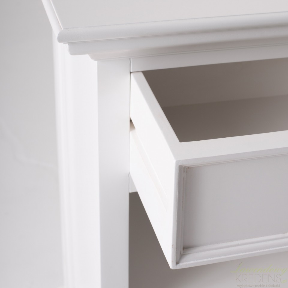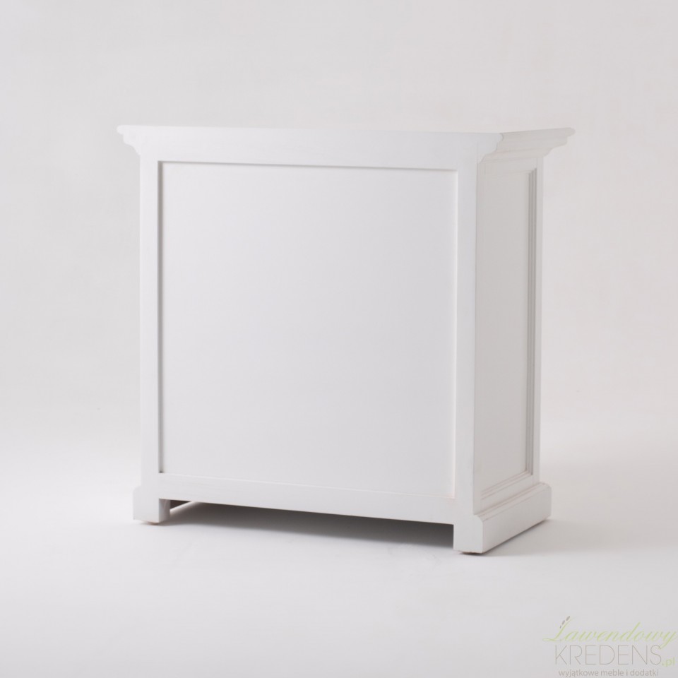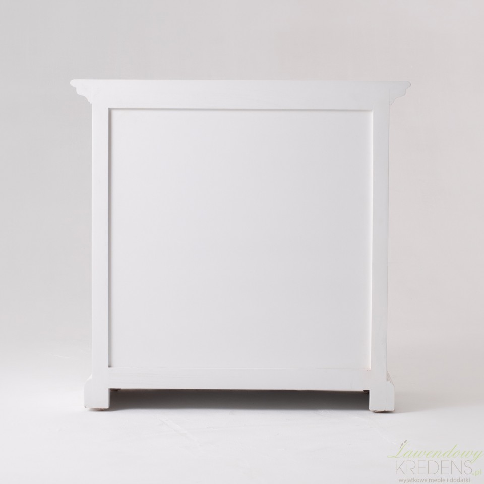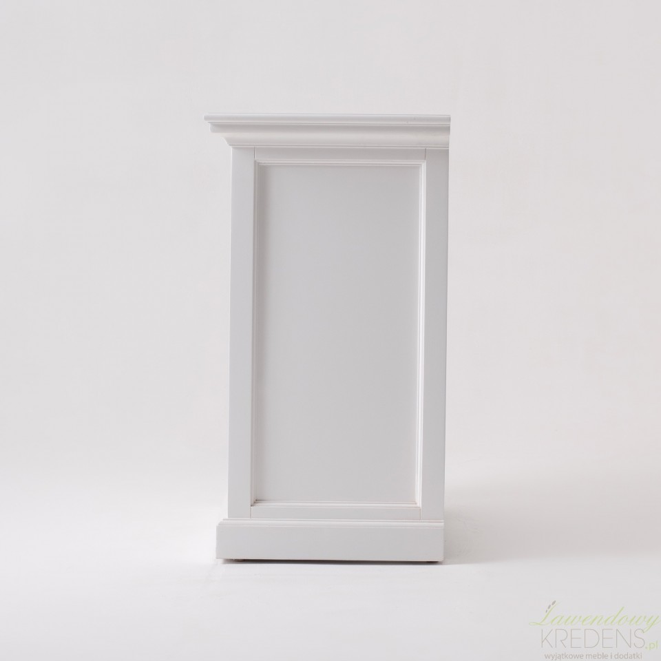 Biała, niska szafka w stylu prowansalskim z kolekcji Lumi ma bardzo prosty kształt wzbogacony o eleganckie frezy, które pozwolą wprowadzić do wnętrza szyk i klasę.