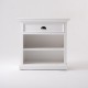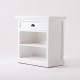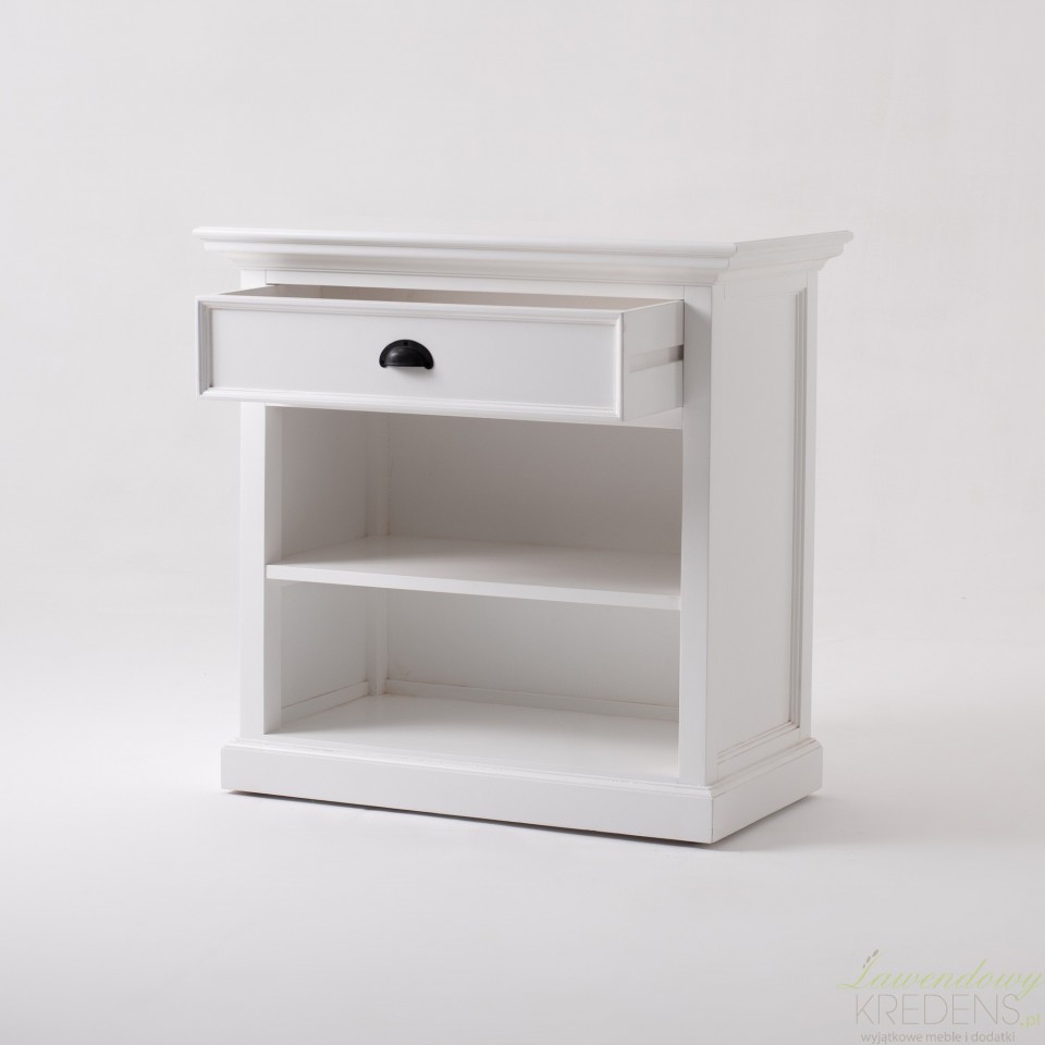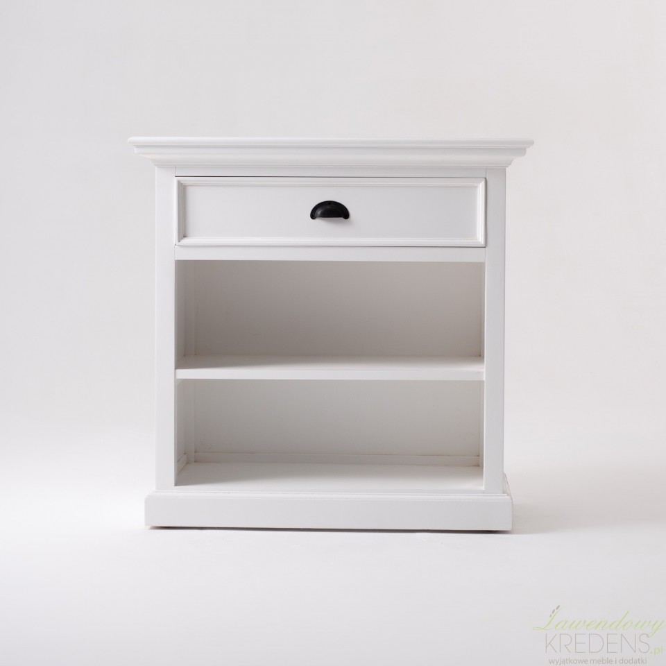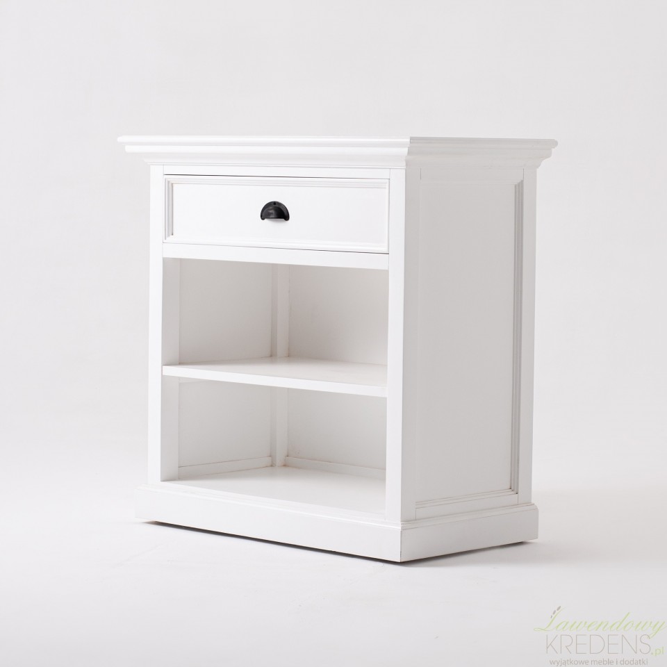 Biała, niska szafka w stylu prowansalskim z kolekcji Lumi ma bardzo prosty kształt wzbogacony o eleganckie frezy, które pozwolą wprowadzić do wnętrza szyk i klasę.