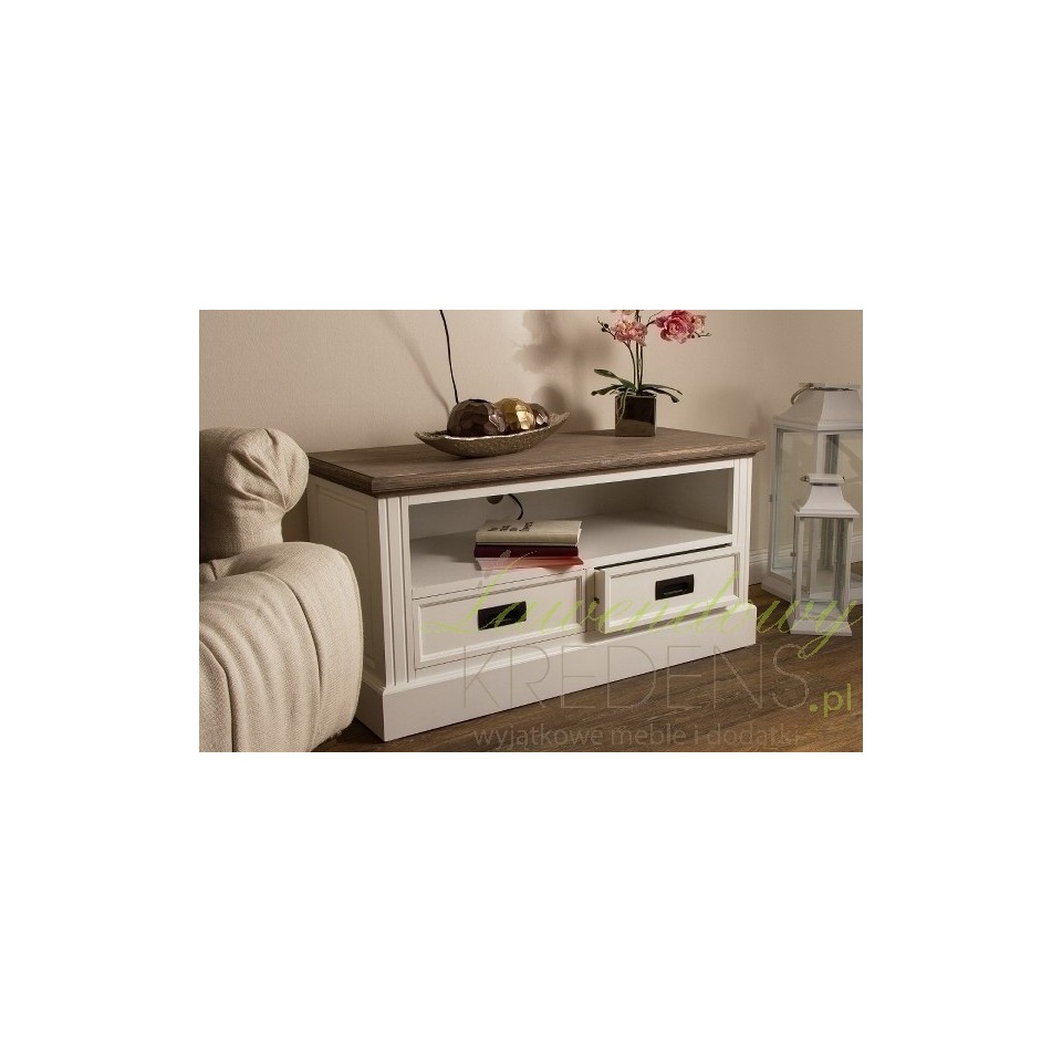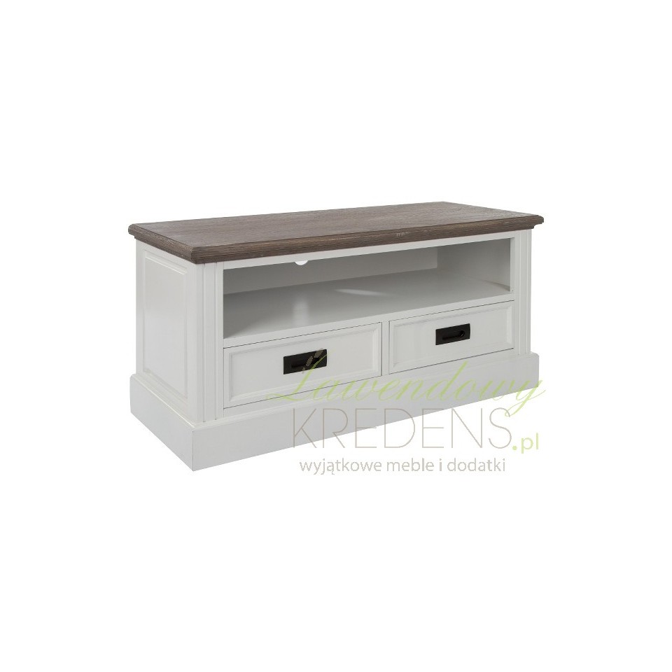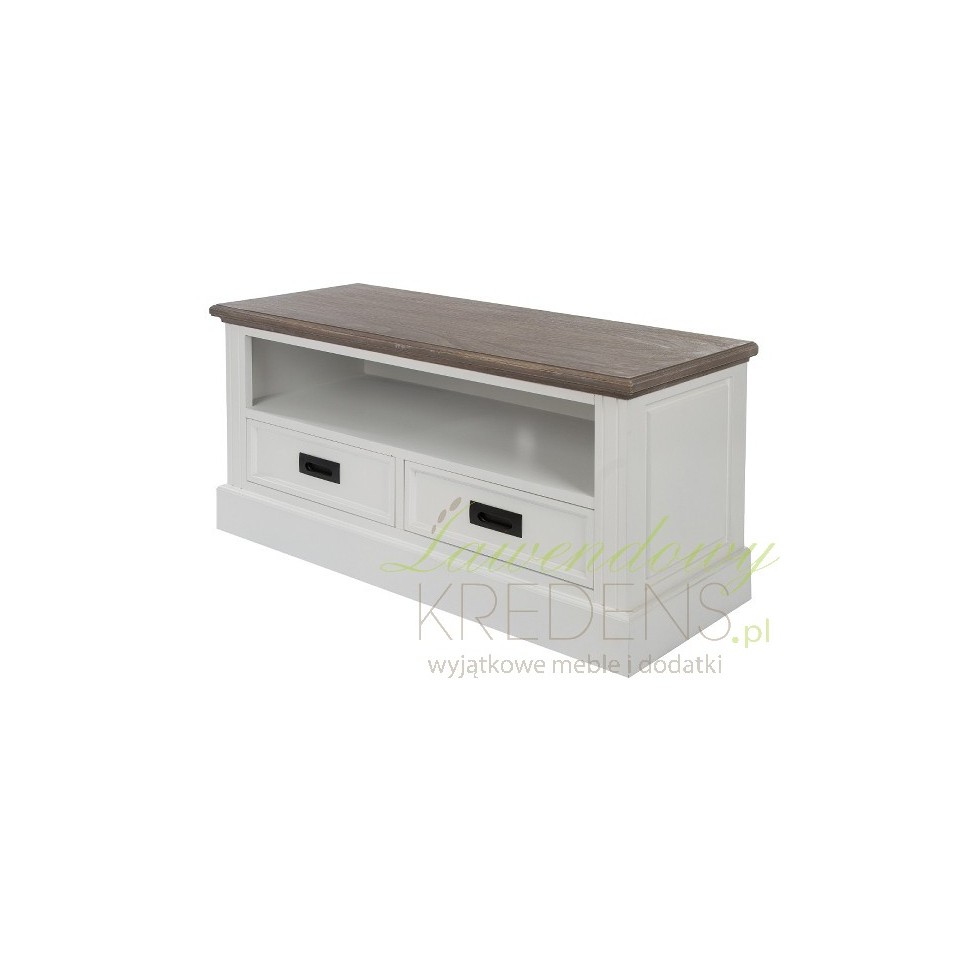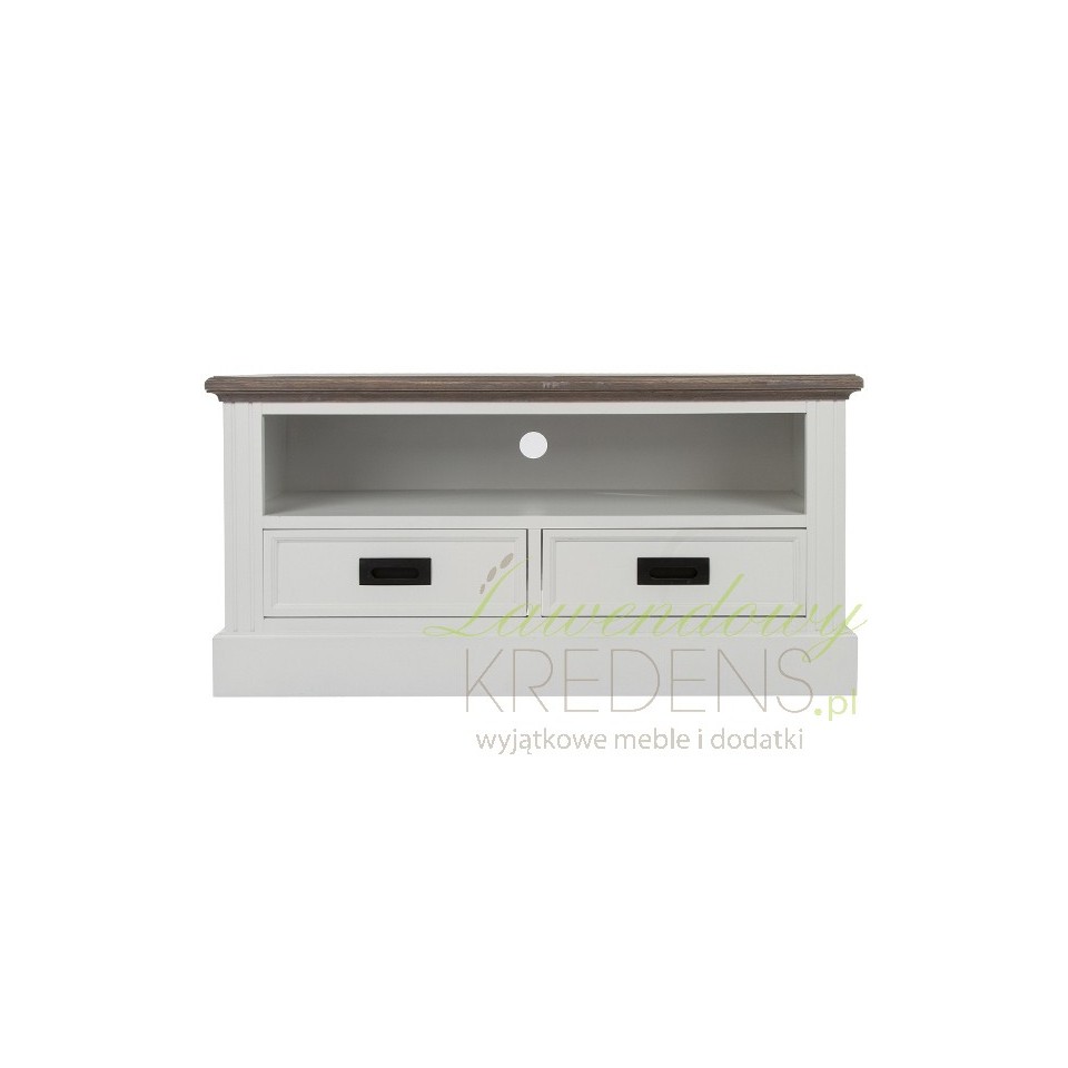 Komoda rtv w stylu prowansalskim składa się z drewnianych elementów malowanych na biało. Komoda jest matowa i ma długi, brązowy blat.