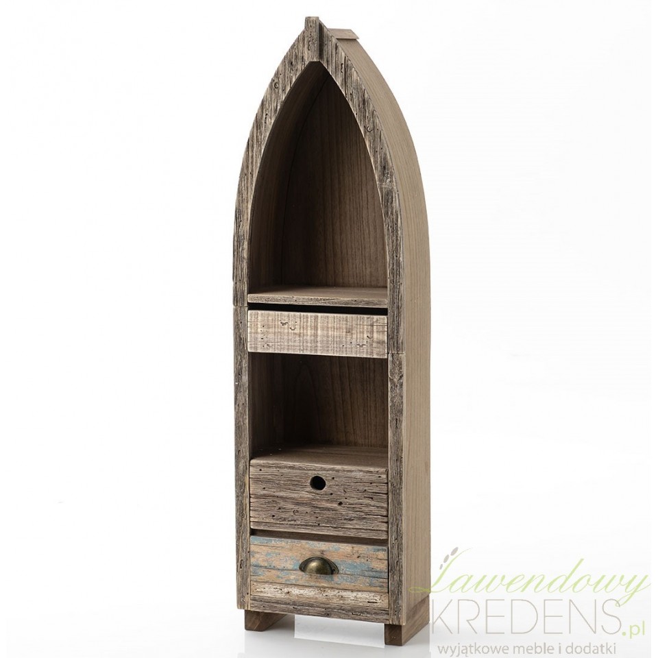Drewniana szafka w stylu marynistycznym w kształcie łódki. Wykonana z drewna z recyklingu będzie interesującym dodatkiem do salonu, pokoju dziecięcego lub do nadmorskiej restauracji. Szafka zwęża się ku górze i przypomina starą, zniszczoną morskimi falami łódź. Szafka marynistyczna posiada półki i szuflady z metalowymi uchwytami dlatego będzie doskonała zarówno do przechowywania jak również sprawdzi się w roli biblioteczki na książki.