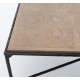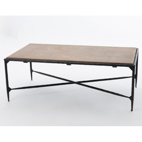 Stół kawowy z drewnianym blatem o niepowtarzalnej strukturze, która wygląda jak ścięte pnie drzew. Dla kontrastu zestawiony z metalową, czarną podstawą.