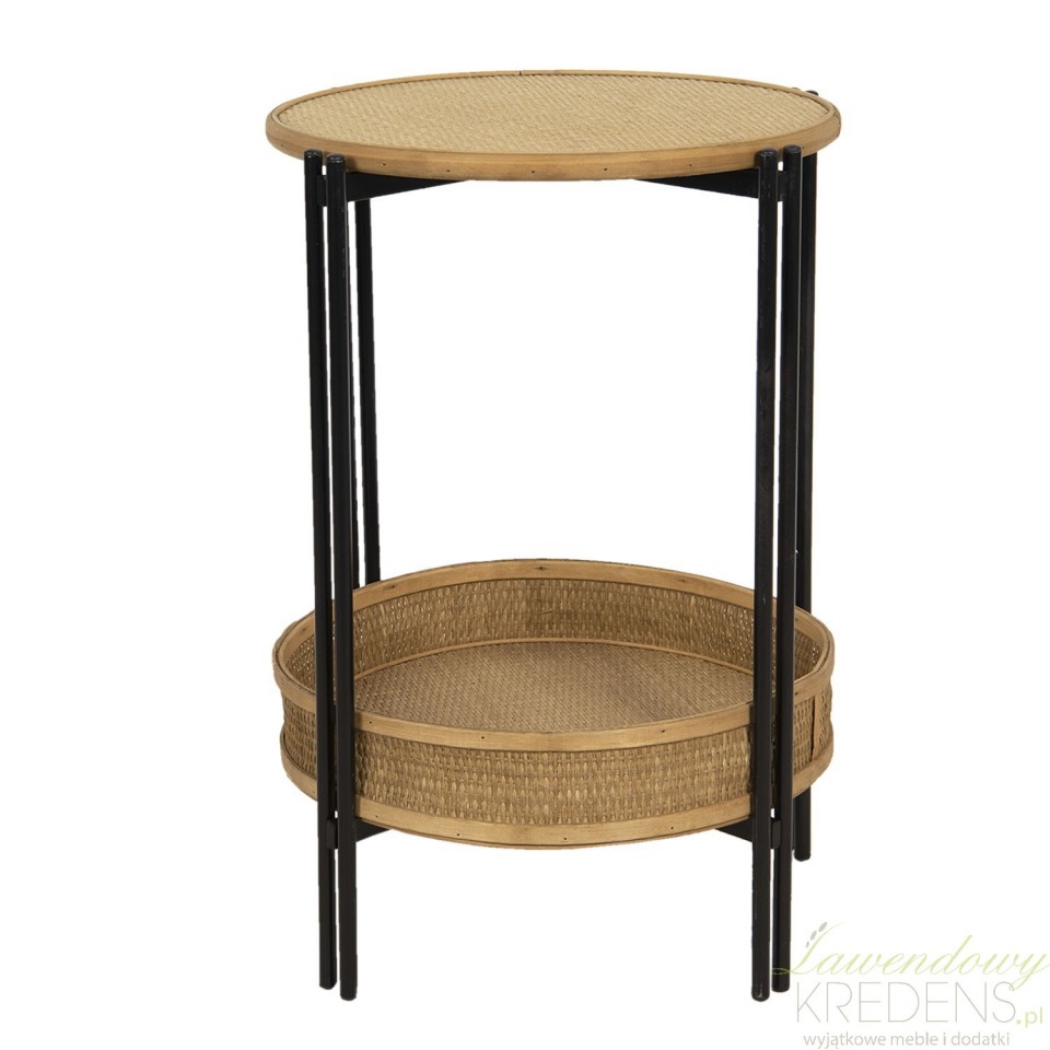 Okragły stolik boczny z plecionym blatem i półką w formie koszyczka przyda się w kuchni, łazience i w salonie.