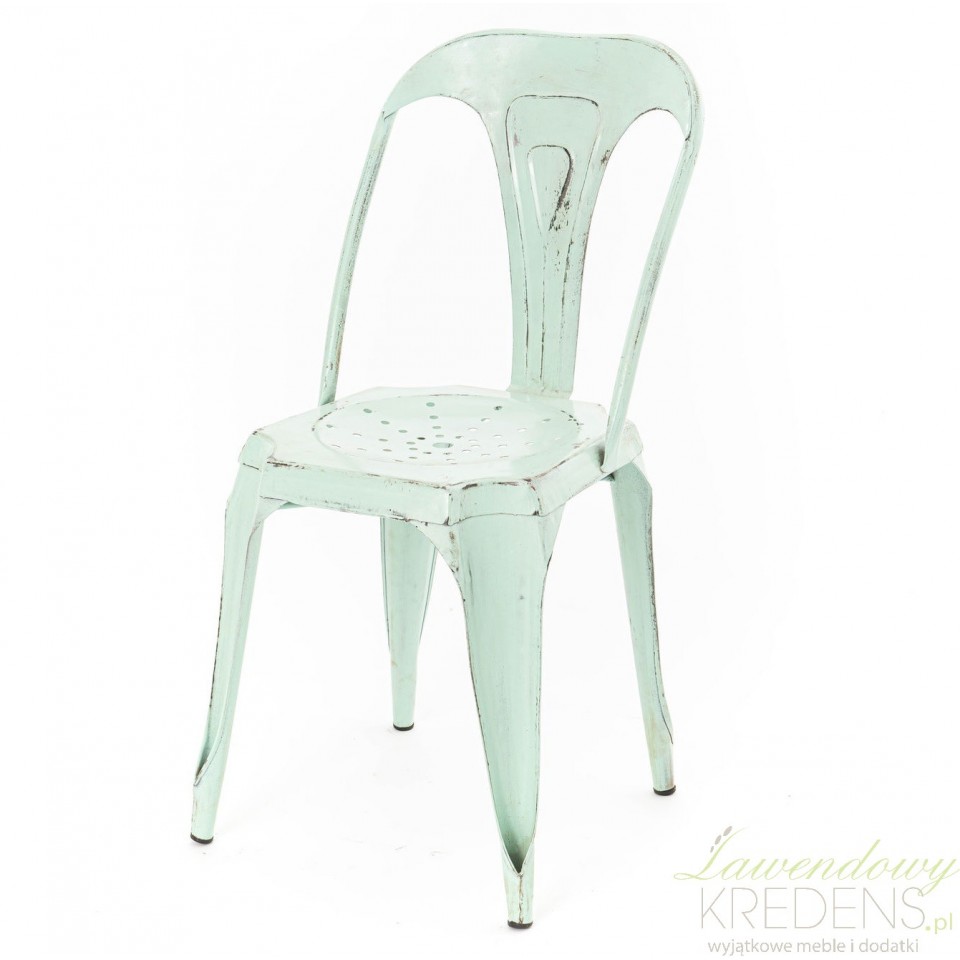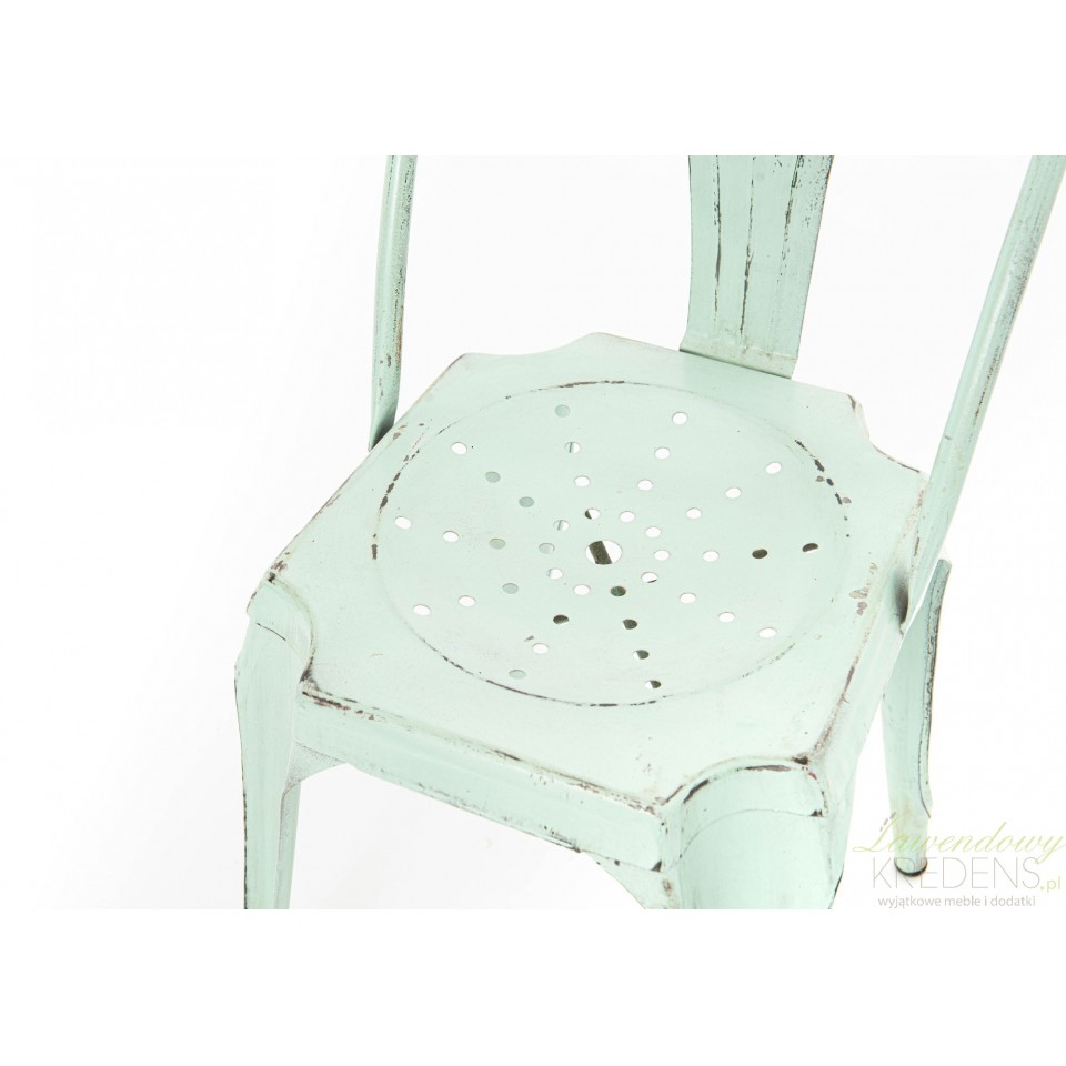 Jasnozielone krzesło loft wyróżnia się nie tylko solidną konstrukcją z metalu ale również umiejętnie naniesionymi postarzeniami na całej powierzchni mebla.