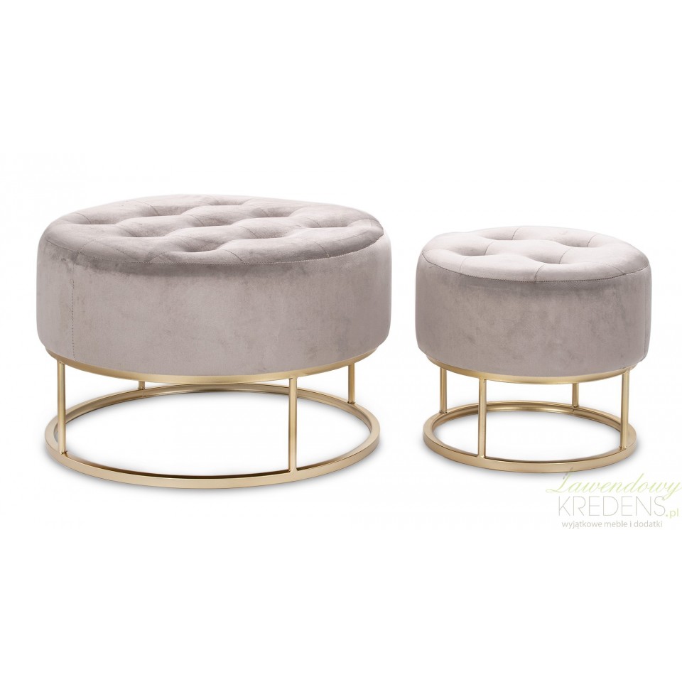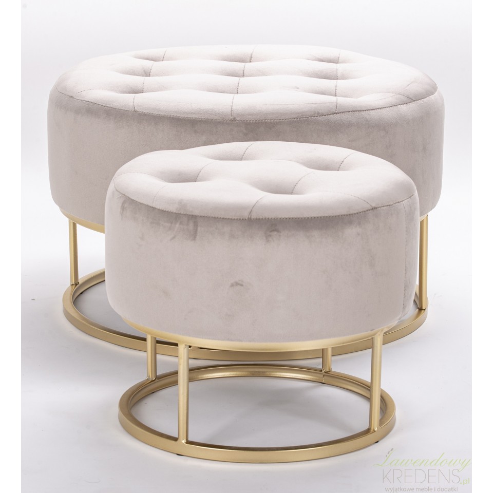 Dwie okrągłe pufy glamour beżowe wyposażone zostały w metalowe podstawy w kolorze złota, z którymi tworzą spójną całość. Wyjątkowość jaką kryją w sobie te meble w stylu glamour wynika przede wszystkim z właściwego dopasowania kolorów i kształtów. Tapicerowane pufy już na pierwszy rzut oka wyglądają jak niezwykle luksusowe siedziska, które aż chce się ustawić w centralnym punkcie aranżacji salonu lub przedpokoju. Meble glamour od firmy Prowansalskie Dekoracje APLMC to zjawiskowe dodatki, które zachwycają bogatym wykończeniem.