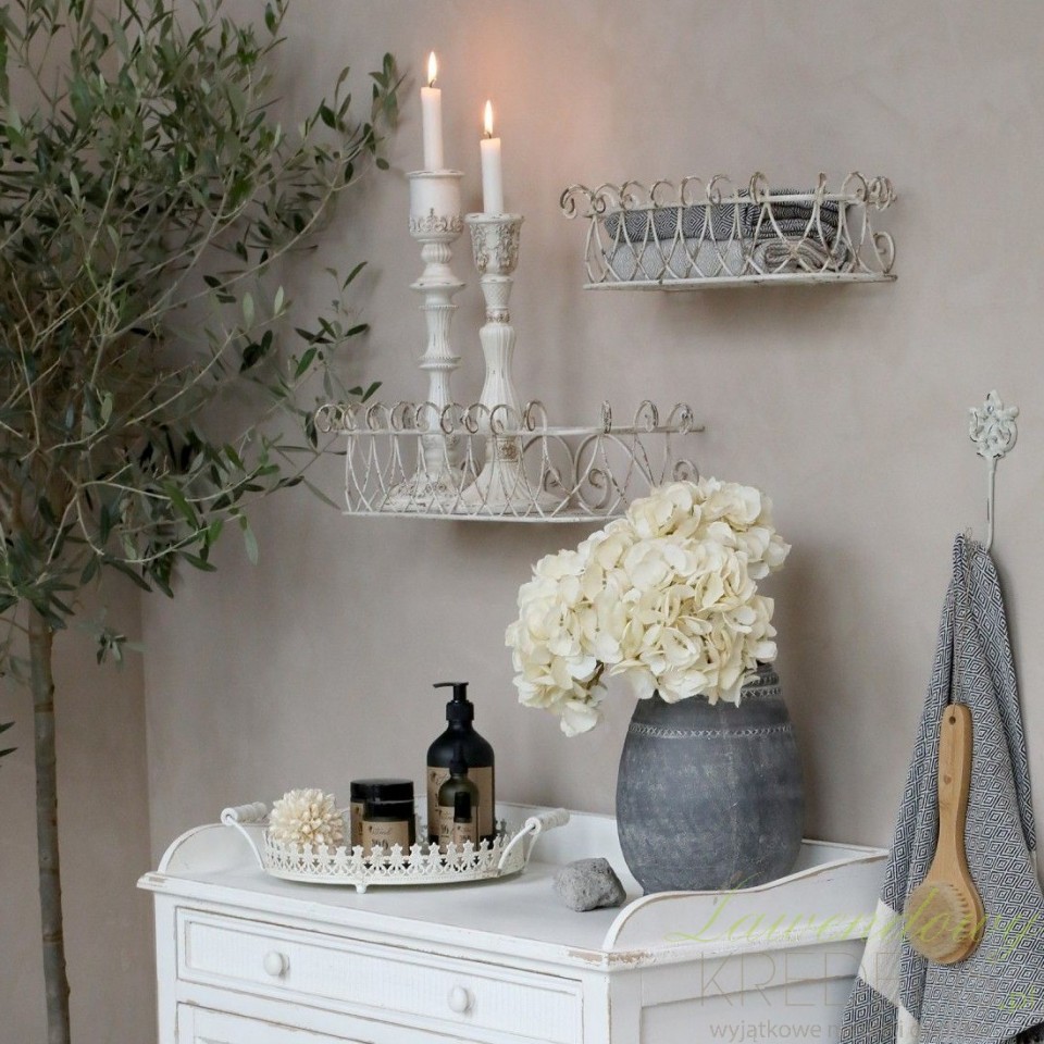 Jasne kolory, urocze ślady postarzeń i artystyczne kształty sprawiają, że romantycznie wyglądające meble w stylu prowansalskim stają się magicznymi, przyciągającymi wzrok elementami wyposażenia współczesnych wnętrz.Co więcej, tego typu meble wprowadzają do wnętrz wyjątkową, marzycielską atmosferę. Prezentowane, urocze półki ścienne prowansalskie to zestaw trzech, różnej długości półek, które można zawiesić w dowolnej konfiguracji – obok siebie lub jedna nad drugą. Półki idealnie nadają się jako miejsce dla mniejszych przyborów, takich jak przyprawy w kuchni lub kosmetyki w łazience.