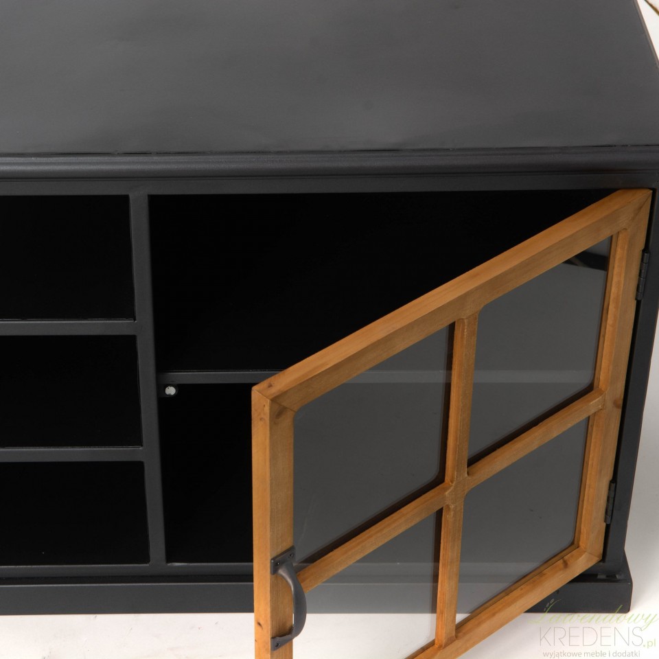 Ta komoda pod telewizor industrialna Robby ma matowe, czarne wykończenie, które pięknie kontrastuje z drzwiami z brązowymi szprosami. Powstała abyś mógł w pełni komfortowo oddać się swojej pasji oglądania seriali, i jesteśmy pewni, że ta szafka pod telewizor zadowoli wszystkich miłośników kina! Wykonana z wysokiej jakości drewna i metalu jest wyjątkowo solidna. Komody w stylu industrialnym znajdą swoje miejsce w wielu pomieszczeniach. Poznaj meble industrialne dostępne w naszej ofercie i wybierz te, które najlepiej pasują do Twojego salonu.