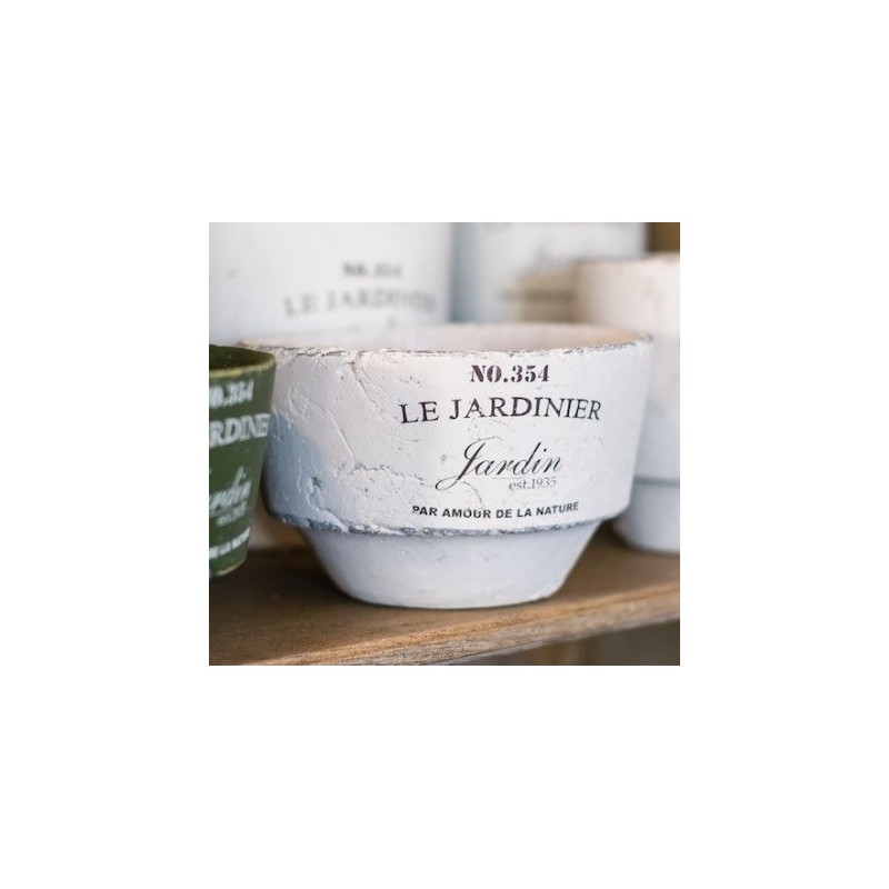 Białe donice Belldeco z kolekcji Simple Le Jardinier z szarymi, delikatnymi przetarciami.