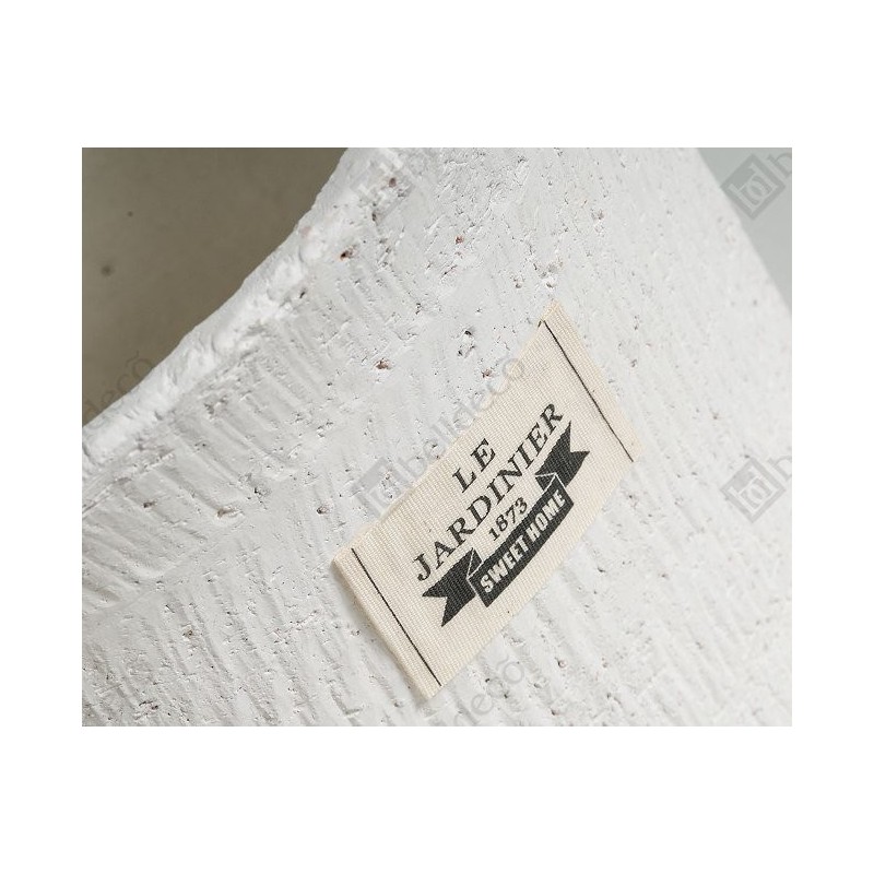 Biała osłonka na doniczkę Belldeco o matowej, nierównej powierzchni. Osłonka ozdobiona jest kawałkiem lnu, na którym znajdują się ozdobne napisy.