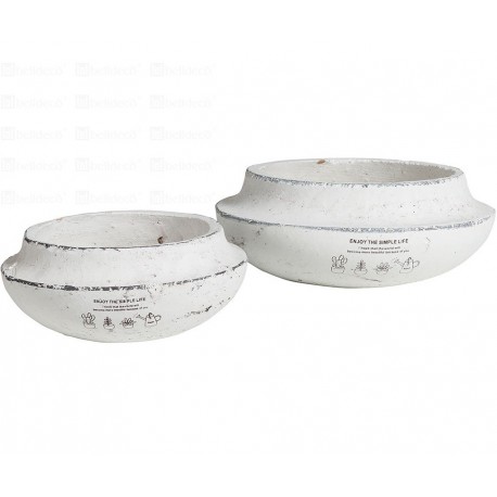 Płaskie doniczki Belldeco z napisami i rysunkami z kolekcji białych donic Simple Enjoy.