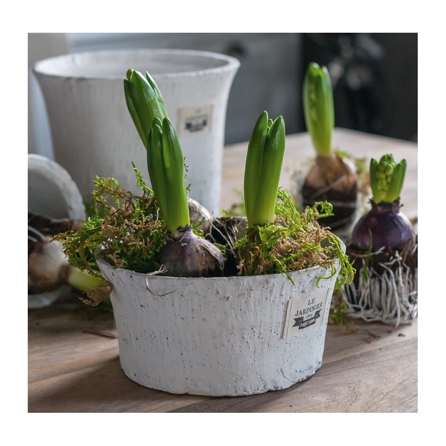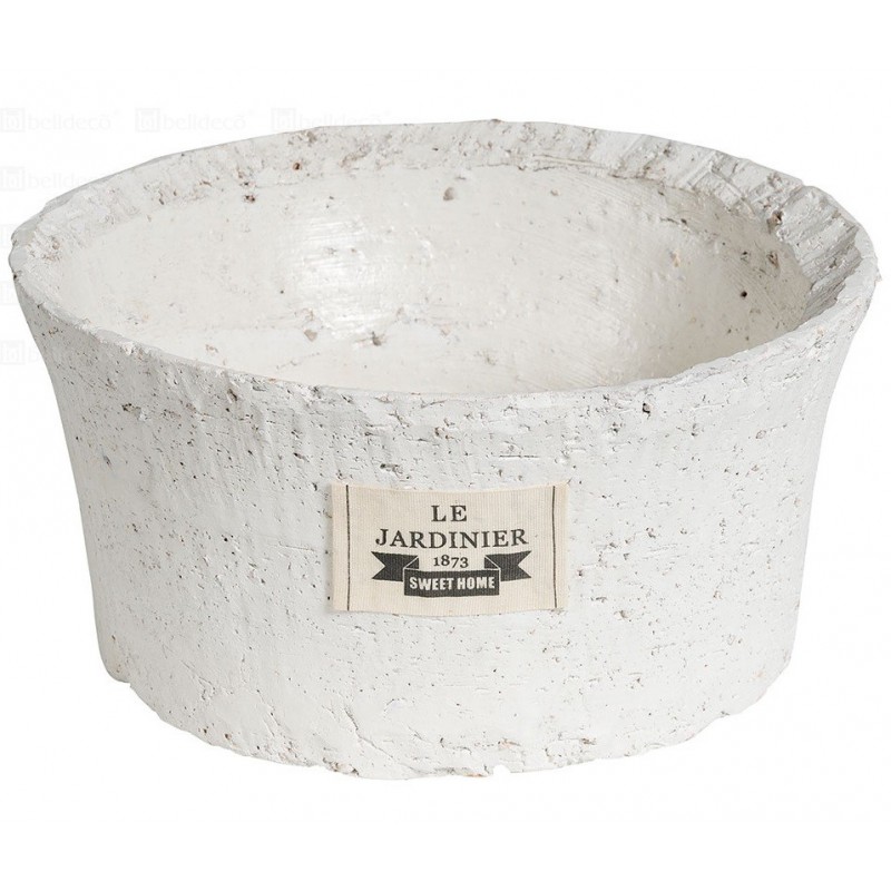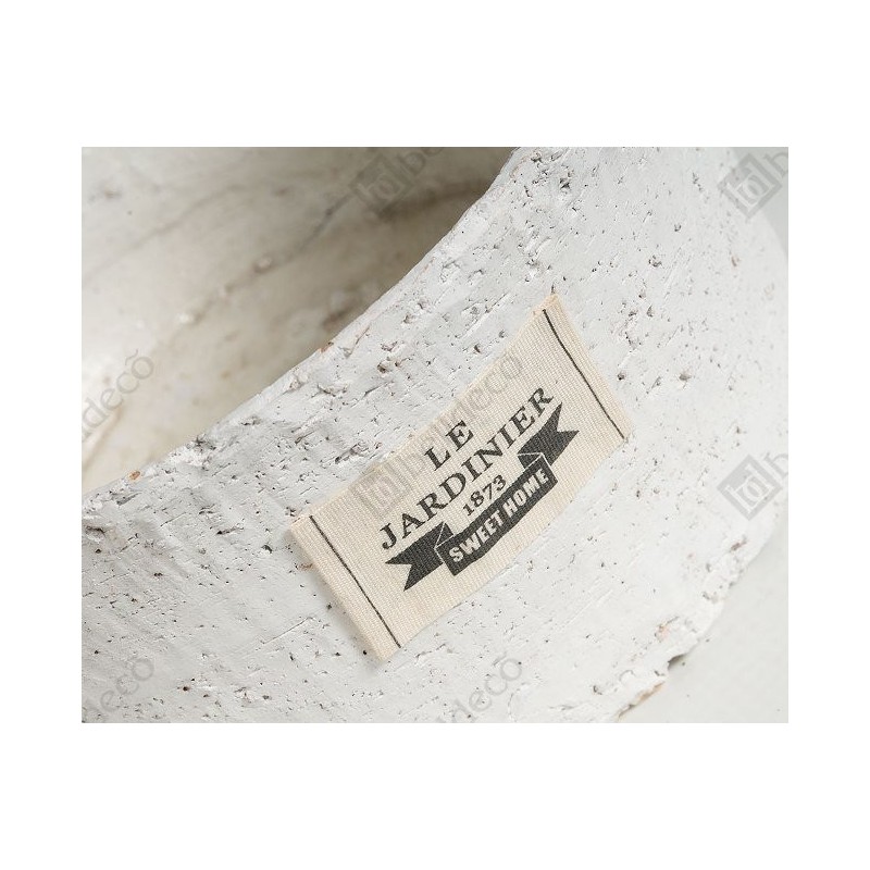 Niskie osłonki na doniczki Belldeco o białym kolorze, do których przylepiony jest ozdobny kawełek lnu z czarnymi napsiami. Powierzchnia osłonek jest matowa, a dzięki bruzdom i nierównościom wygląda bardzo efektownie.