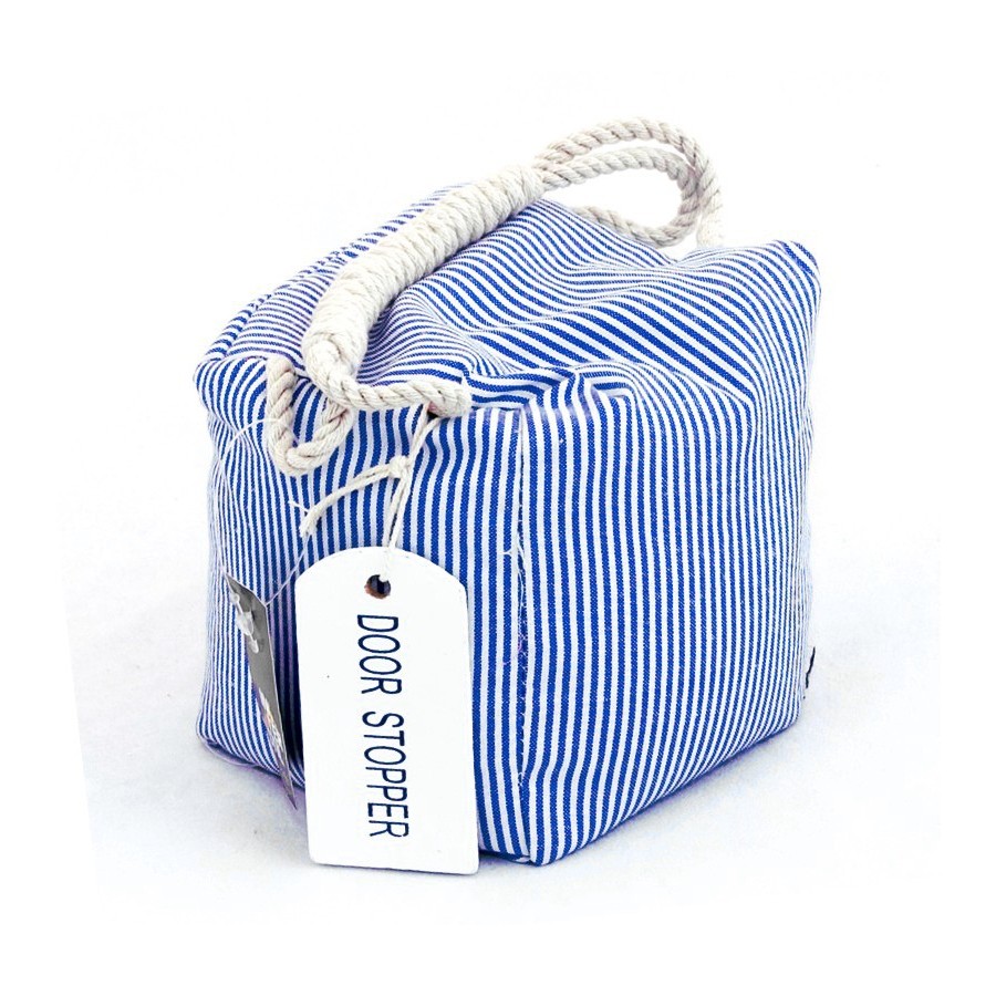 Stopery do drzwi w praktycznej formie bawełnianego woreczka wypełnionego piaskiem z uchwytem w stylu marynistycznym. Niebiesko biała tkanina w dość gęste paski nie dość, że nie przyciaga uwagi gości, to może w rewelacyjny sposób stać się elementem stylizacji wnętrza.