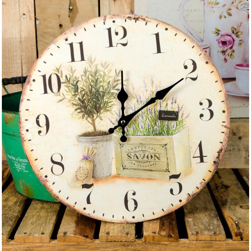 Okrągły zegar prowansalski z lawendą w drewnianej skrzynce oraz drzewkiem oliwnym w doniczce na jasnym tle. Przy krawędzi zegara tło jest nieco ciemniejsze, co dodaje zegarowi starego stylu. Zegar ma średnicę 34cm, a jego tarcza zrobiona jest z płyty mdf.