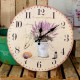 Niezwykle urzekające zegary ścienne z motywem kwitnącej lawendy w jasnej doniczce na tle stylizowanej tarczy.