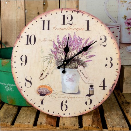 Klimatyczny zegar z lawendą doskonale nadaje się do wnętrz w stylu prowansalskim, ale nie tylko. Tarcza o średnicy 34 cm, z płyty MDF jest specjalnie wykonana, tak aby wyglądała na starą, a dodatkowe przetarcia na krawędziach dodają zegarowi uroku. Znajdująca się w centrum kompozycja kwiatowa i delikatne napisy wókół tworzą niezapomniane wrażenie wizualne.