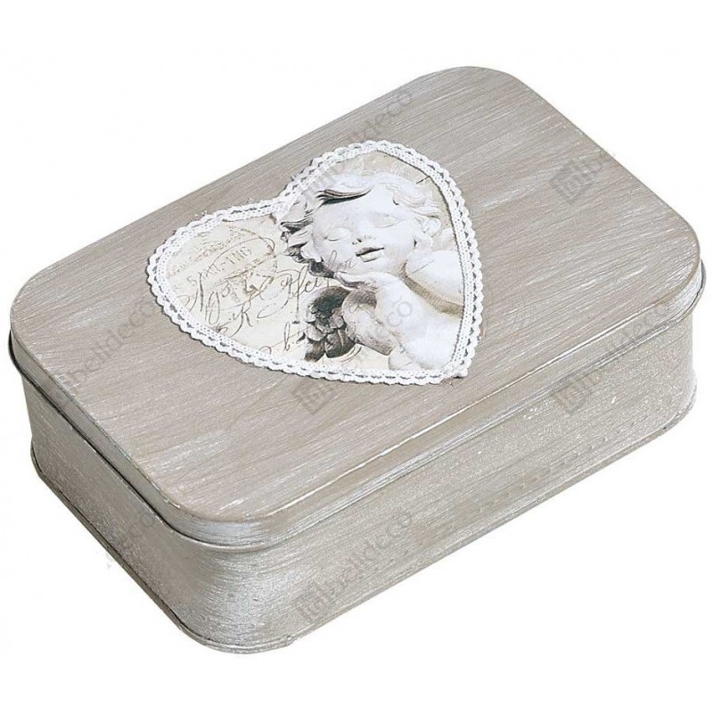 Metalowe pudełko Belldeco z amorem mające szaro-białą kolorystykę.