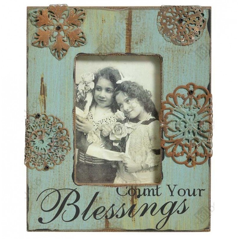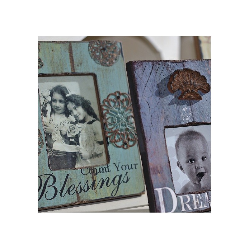 Drewniana ramka na zdjęcia Belldeco z angielskimi napisami. Ramka posiada rdzawe przetarcia i jest stylizowana na starą.