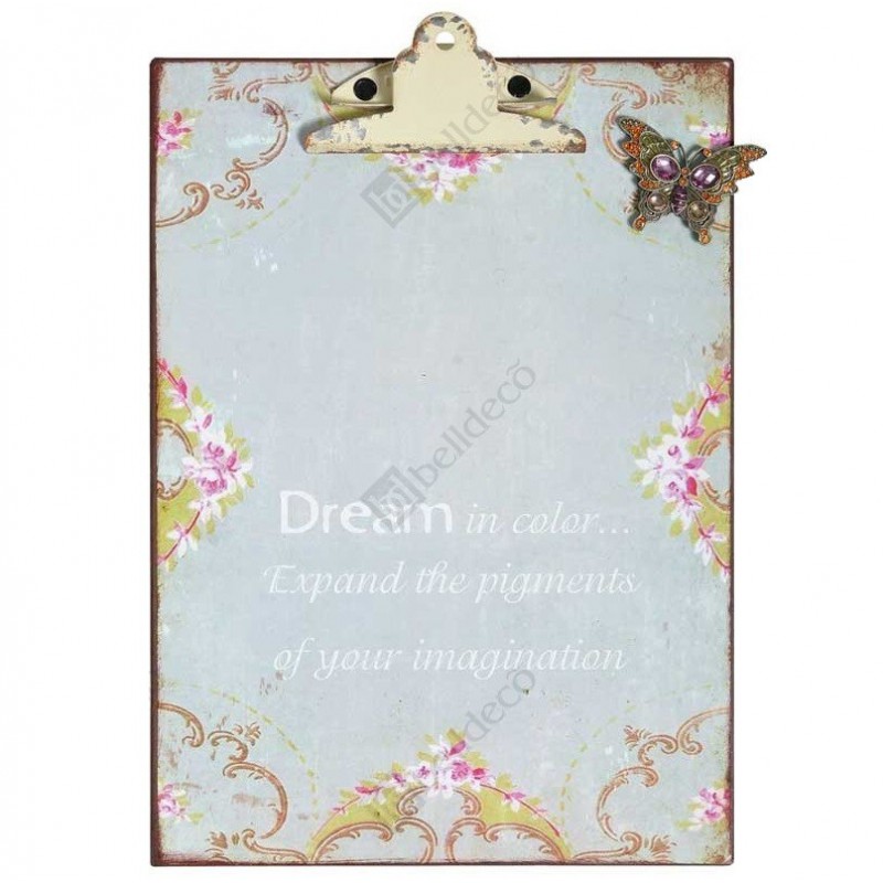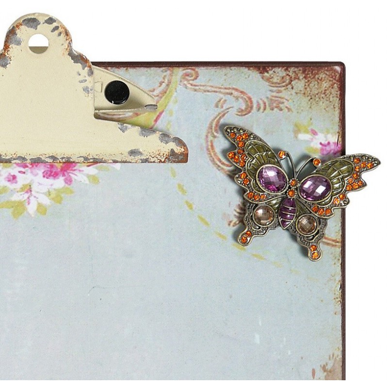 Śliczna, metalowa podkładka pod notatki marki Belldeco ozdobiona motylkiem i białymi napisami. Z tyłu podkładka posiada uchwyt, dzięki któremu można ją powiesić na ścianie.