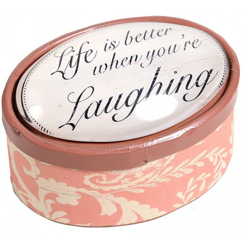 Owalne pudełko z napisem wykonane w stylu retro i wyposażone w ozdobione pozytywnym przekazem wieczko, to ładny pojemnik na drobiazgi. Dolna część pudełka została artystycznie udekorowana wzorami w kształcie rozłożystych liści. Kolorystykę utrzymano w tonie biało-łososiowym.