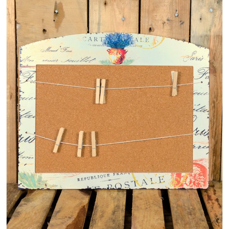 Prowansalska tablica korkowa ozdobiona motywem lawendy znajdującym się na drewnianej ramie. Zdjęcia i notatki można przyczepiać do tablicy także za pomocą drewnianych spinaczy.