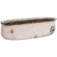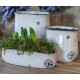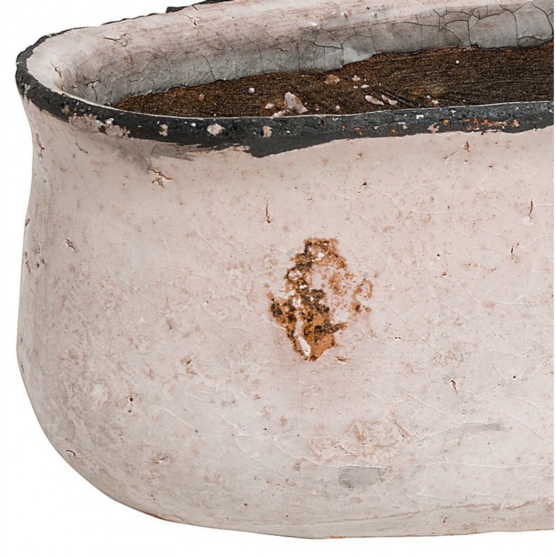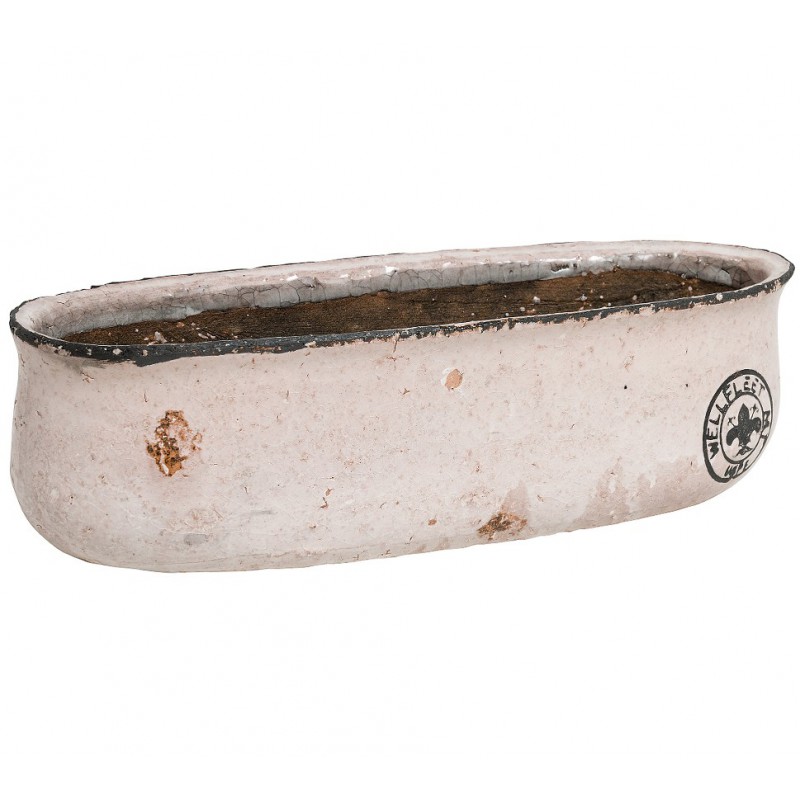 Ceramiczne korytka Belldeco, czyli podłużne donice w stylu prowansalskim o powierzchi pokrytej odpryskami farby i bruzdami. Na dole korytek znajduje się czarny, ozdobny stempel. Korytka nie posiadają otworów na odpływ wody.