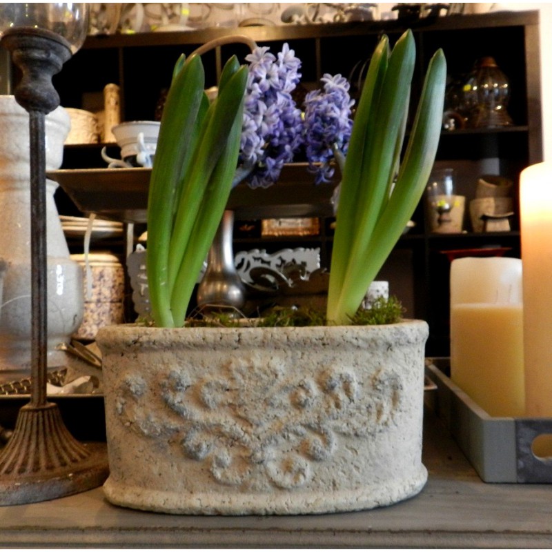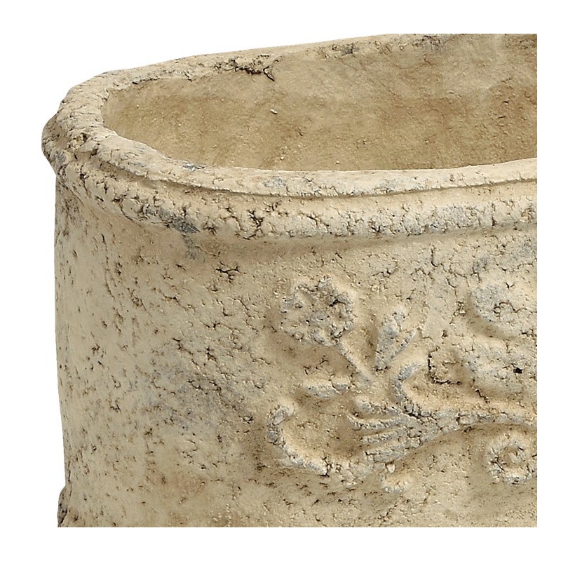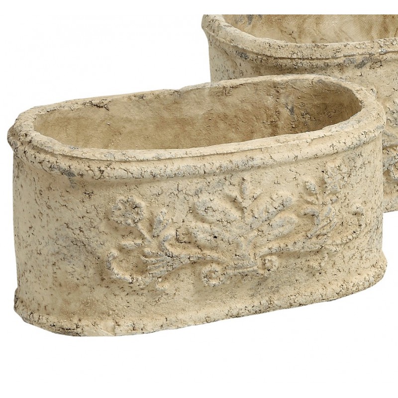 Podłużne donice Belldeco z serii donic Casa Creme o chropowatej fakturze, ozdobionych wypukłym wzorem.