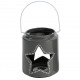 Lampion Belldeco w kształcie pękatej puszki z połyskiem, utrzymany w kolorystyce ciemnej, ładnie wyglądającej szarości to niezwykły lampion, wyposażony w metalowy pałąk. Na bokach lampionu, wycięto rozłożyste gwiazdki i udekorowano je, białymi kropkami dokoła.