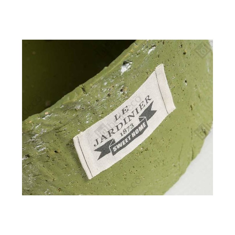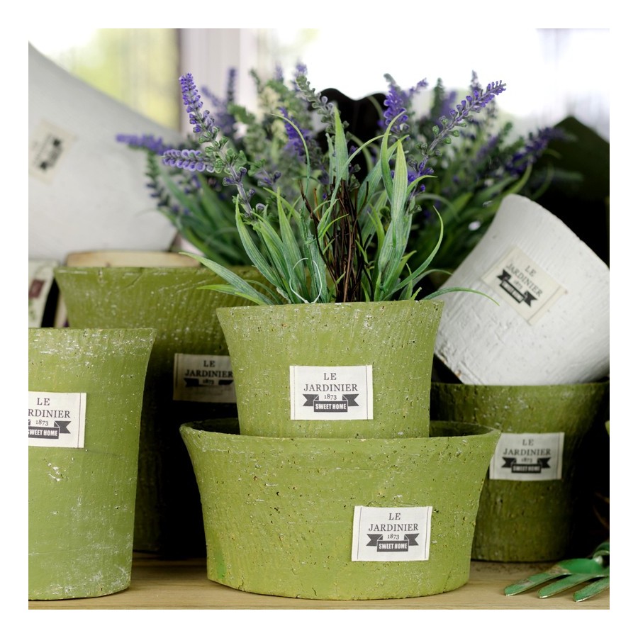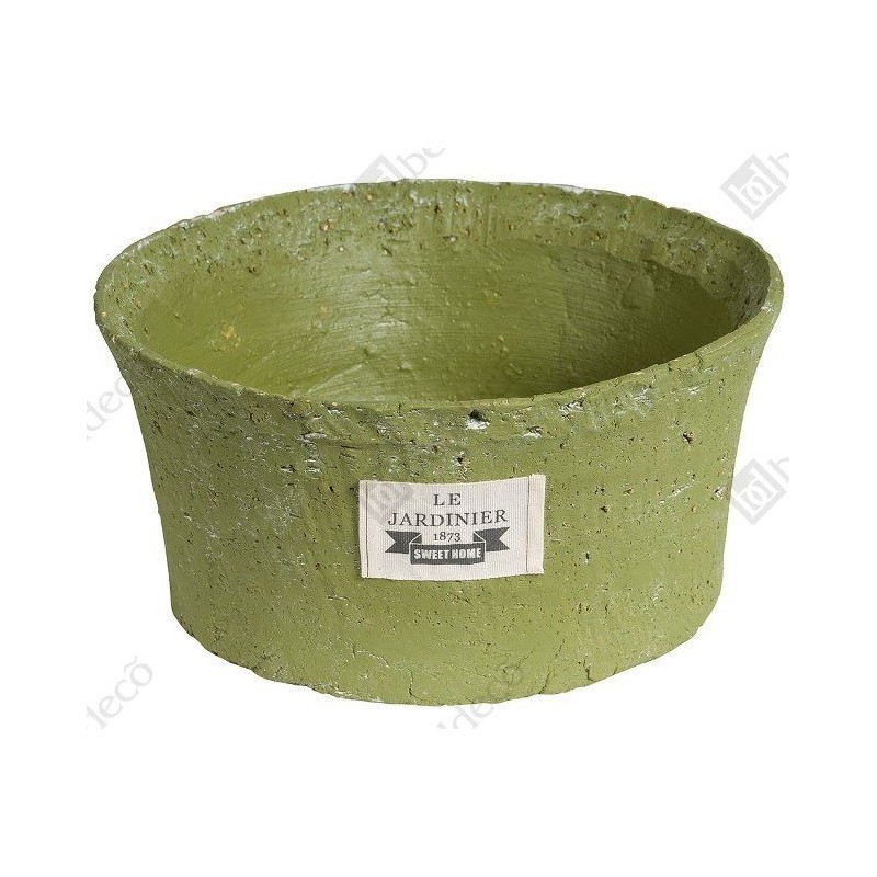 Zielone, niskie osłonki na donice Belldeco o nieszkliwionej, chropowatej powierzchni i o delikatnie rozszerzającym się ku górze kształcie. Stylistyka osłonek inspirowana jest stylem prowansalskim. Z jednej strony do osłonek przylepiony jest kawałeczek lnu ozdobionego napisami.