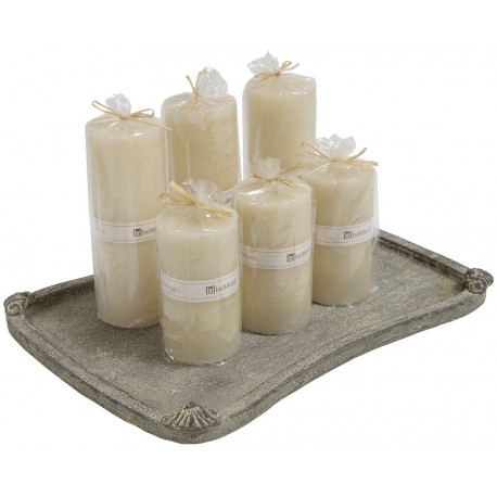Świece Belldeco z kolekcji Wenecja o chropowatej powierzchni, kremowym kolorze i waniliowym zapachu. Świeca przewiązana jest etykietką, na której widnieje napis Belldeco.