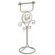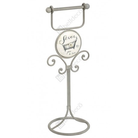 Uchwyt do papieru łazienkowego Grigio marki Belldeco wykonany z metalu. Stojak pomalowany jest na szary kolor i posiada ozdobną, kremową tabliczką z francukimi napisami oraz rysunkiem wanny.
