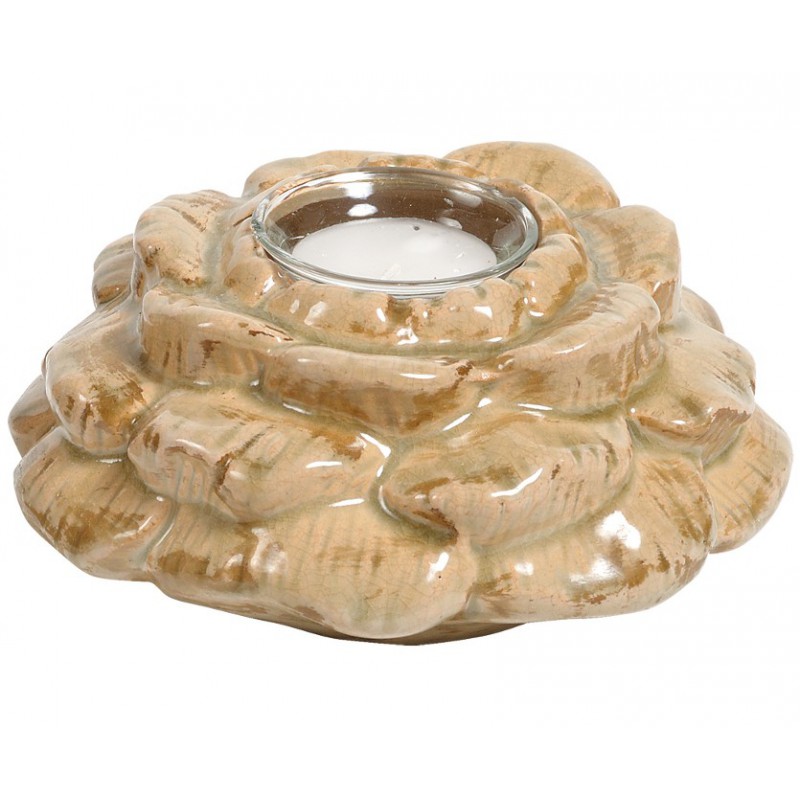 Piękny świecznik Belldeco z kolekcji Piasek Pustyni, wykonany z terakoty. Świecznik ma kształt przypominający kwiat. Do świecznika dołączony jest szklany wkład ze świeczką.