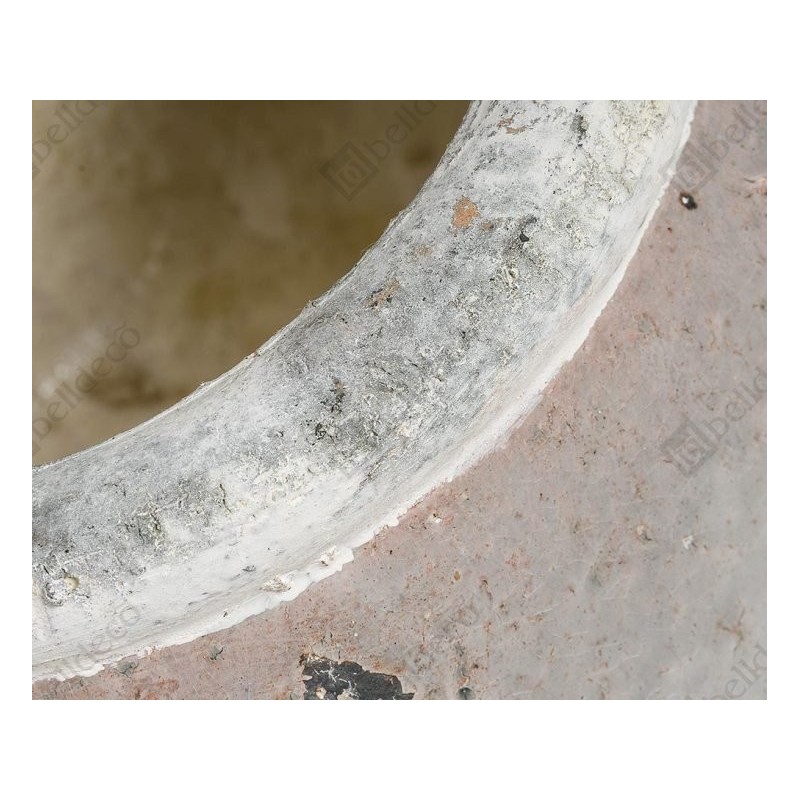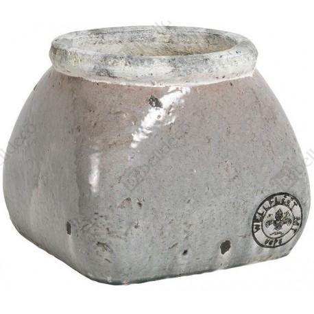 Postarzane osłonki na doniczki Belldeco wykonane z ceramiki. Powierzchnia osłonek wygląda bardzo efektownie, jest spękana i znajdują się na niej nieregularne odpryski. W dolnej części osłonki ozdobione są czarnym wzorem w kształcie pieczęci z lilijką.
