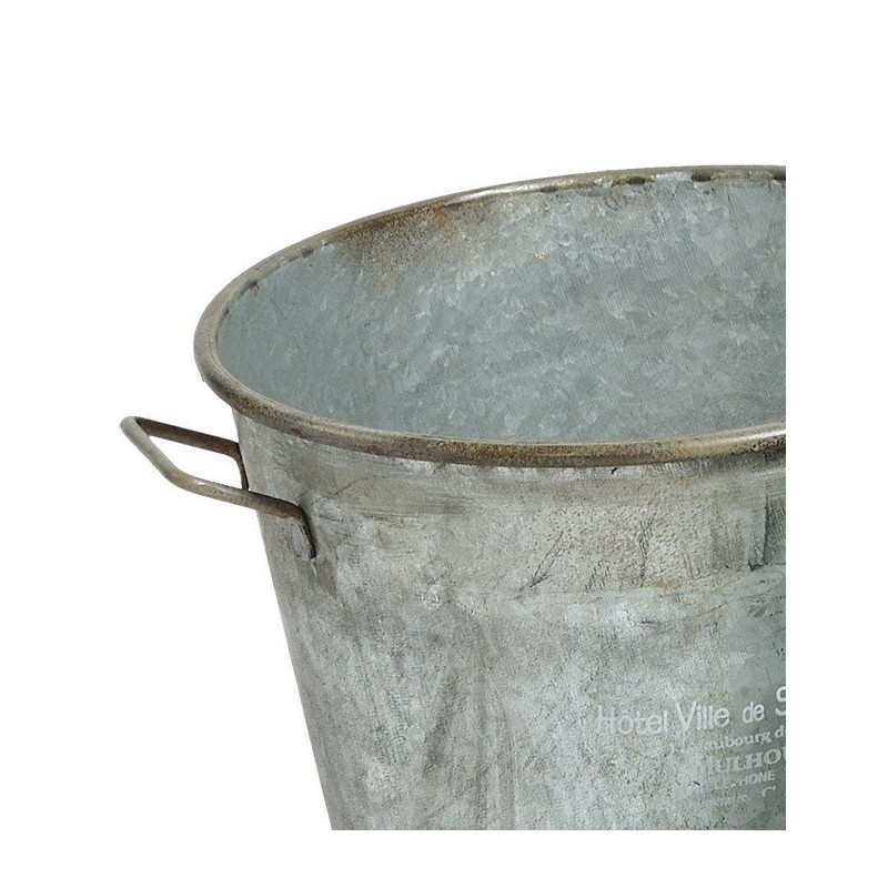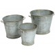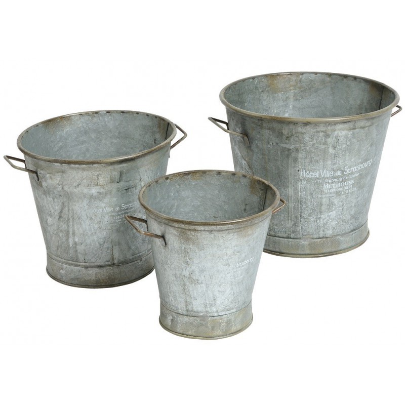 Metalowe osłonki na doniczki o kształcie wiaderka z kolekcji Hotel Ville Gray Belldeo. Wiaderka wykonane są z ocynkowanej blachy na której widnieją białe napisy.