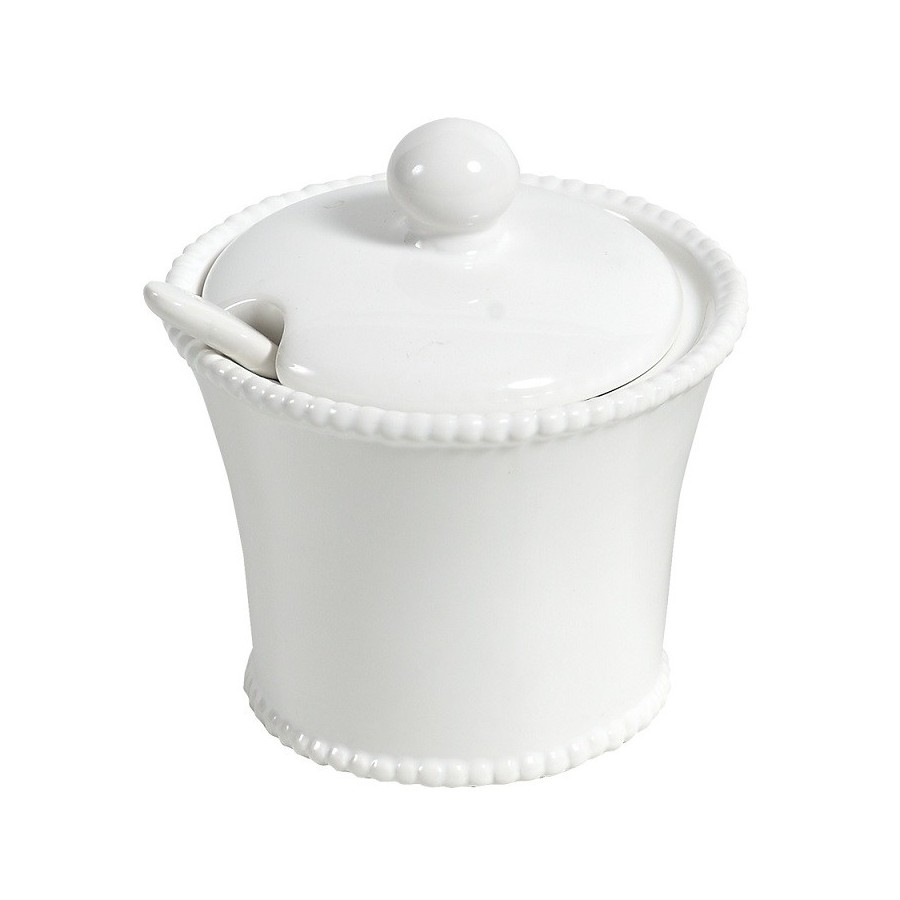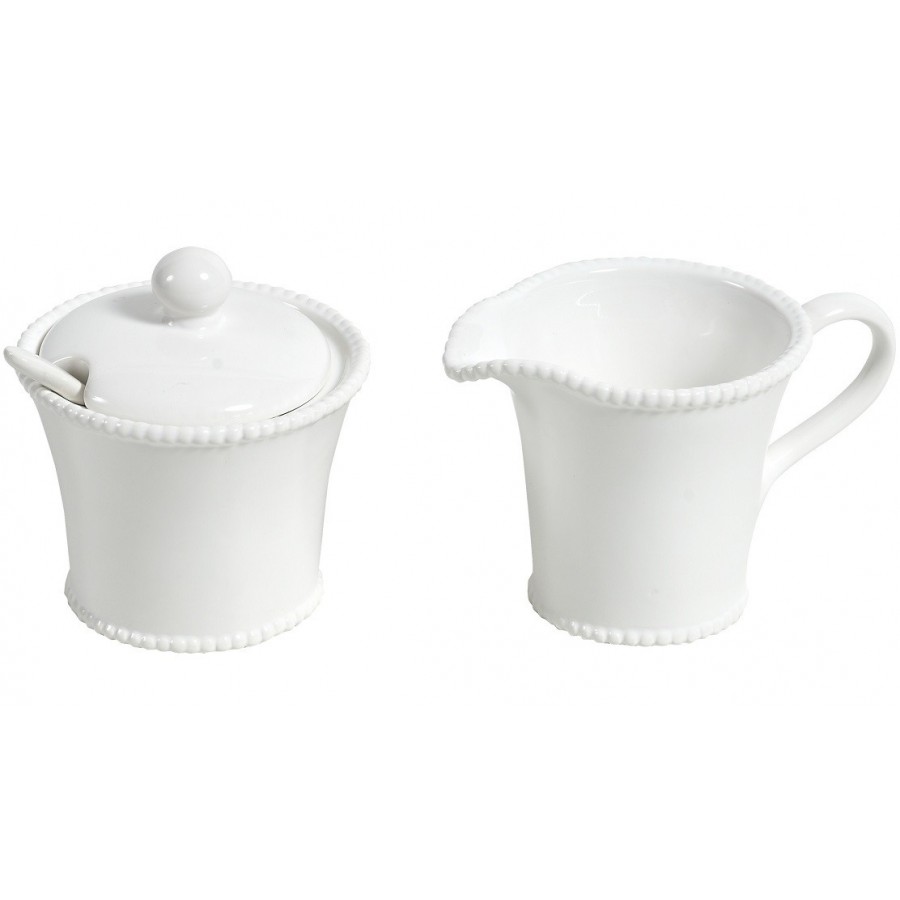 Cukiernica Belldeco wraz z mlecznikiem zostały wykonane z białej, delikatnie wyglądającej ceramiki. Mlecznik posiada odpowiednio wyprofilowany dzióbek, dzięki któremu naczynka używa się z gracją. Cukiernica wyposażona jest w ładnie wyglądającą przykrywkę, zakończoną malutką i zgrabną kuleczką. Pod przykrywką umieszczono łyżeczkę. Zestaw posiada jednorodne zdobienia – zarówno cukiernica, jak i mlecznik udekorowano delikatnymi żłobieniami umieszczonymi na rantach naczynek. Ceramika Belldeco - elegancja, szyk i piękna prostota zdobień!