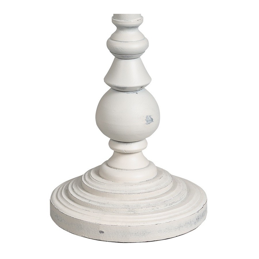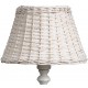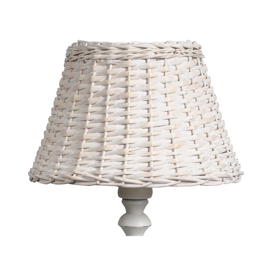 Romantic Lampa Belldeco w stylu shabby chic mająca przecieraną, drewnianą podstawę i rattanowy abażur.