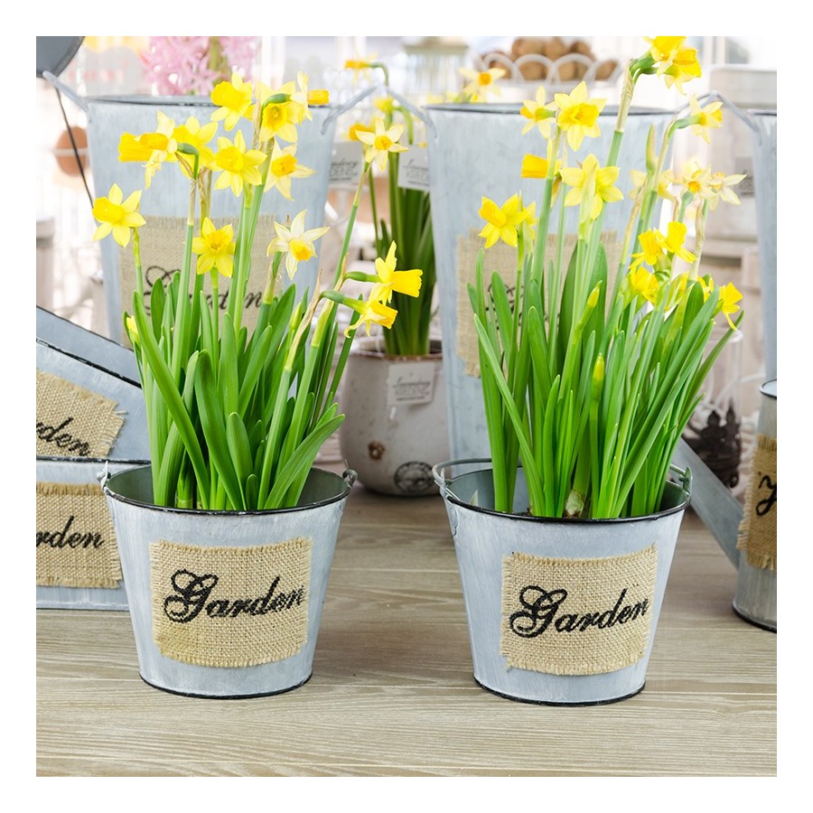 Metalowe osłonki na doniczki z dekoracyjnym napisem Garden na kawałku płótna. Osłonki mają ruchomą rączkę z drewnianym uchwytem.