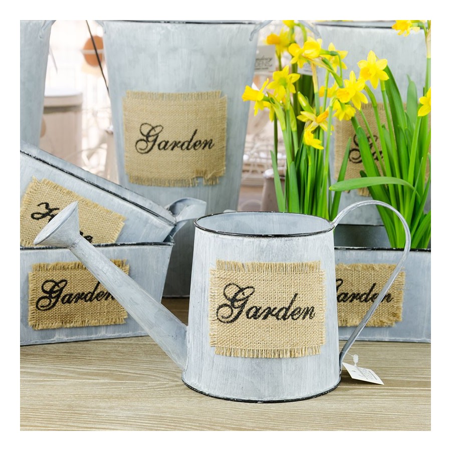 Konewka prowansalska z nadrukowanym na jucie napisem GARDEN. Świetna gdy chcesz stworzyć ogródek czy rabatę w stylu prowansalskim. Wykonana z metalu z poręcznym uchwytem i szerokim lejkiem. Ułatwi i uprzyjemni pracę w każdym ogrodzie.