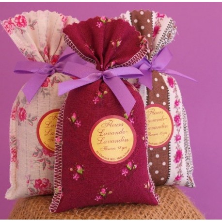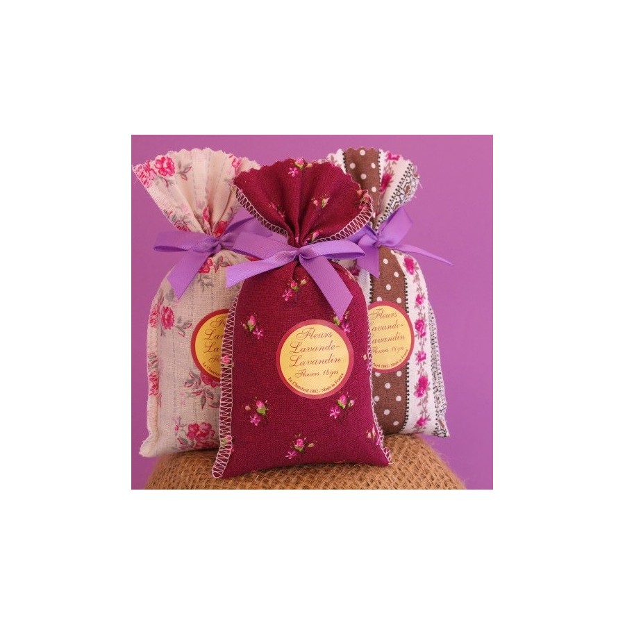 Trzy ozdobne woreczki z suszoną lawendą pochodzącą z francuskich upraw.