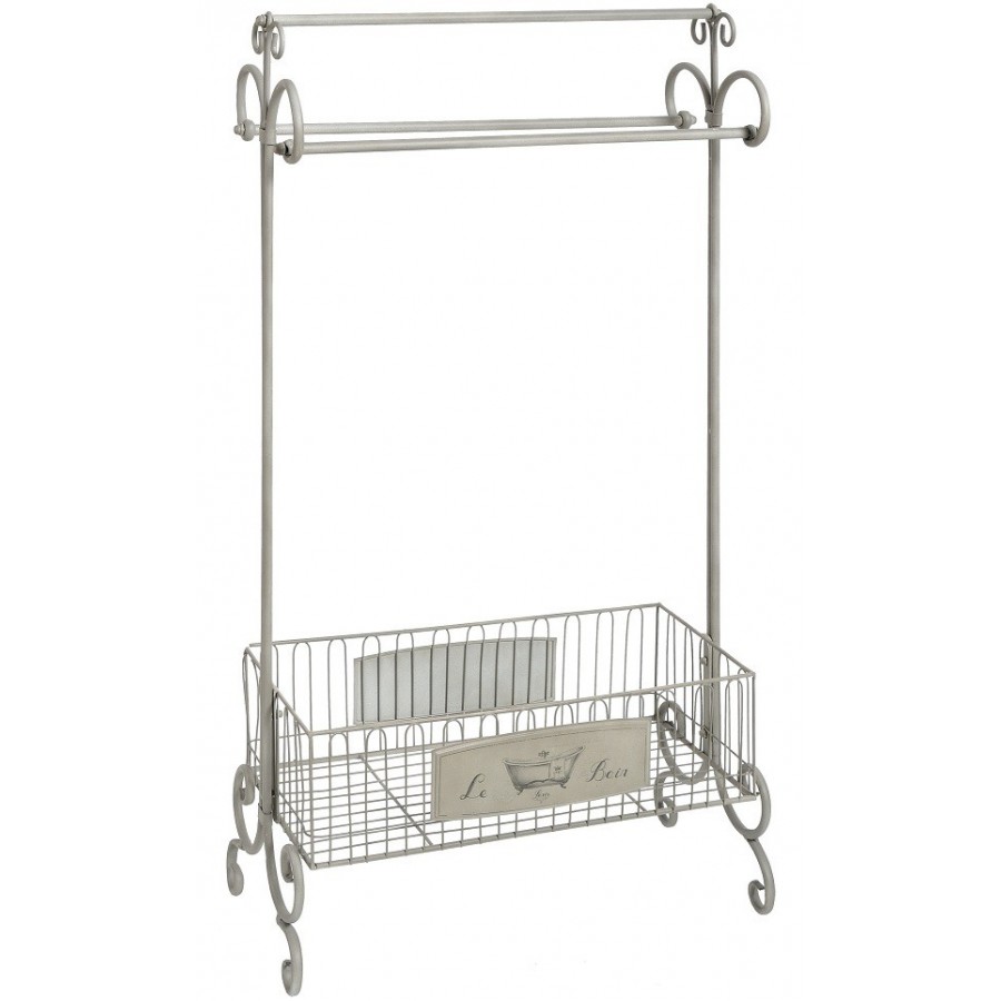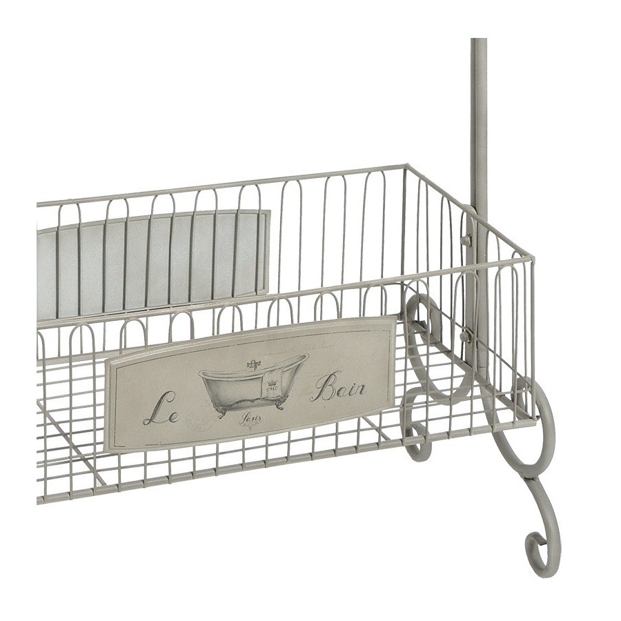 Metalowy stojak na ręczniki Belldeco Grigio. W jego górnej częsci można powiesić ręczniki, natomiast w metalowym koszu znajdującym się w dolnej części stojaka można położyć ręczniki lub kosmetyki. Kosz ozdobiony jest tabliczką w stylu francuskim z rysunkiem wanny oraz napisem Le Bain. Do kompletu polecamy inne dodatki do łazienki Belldeco.