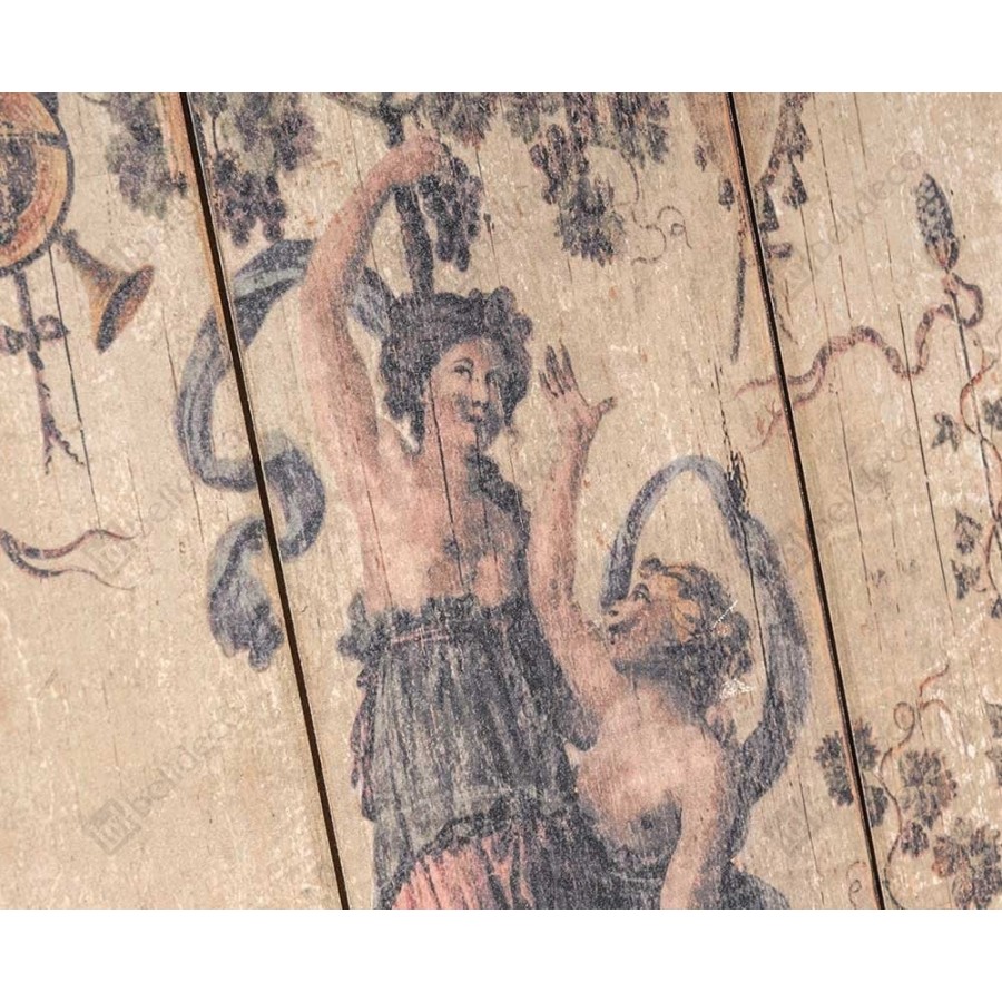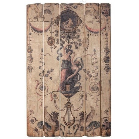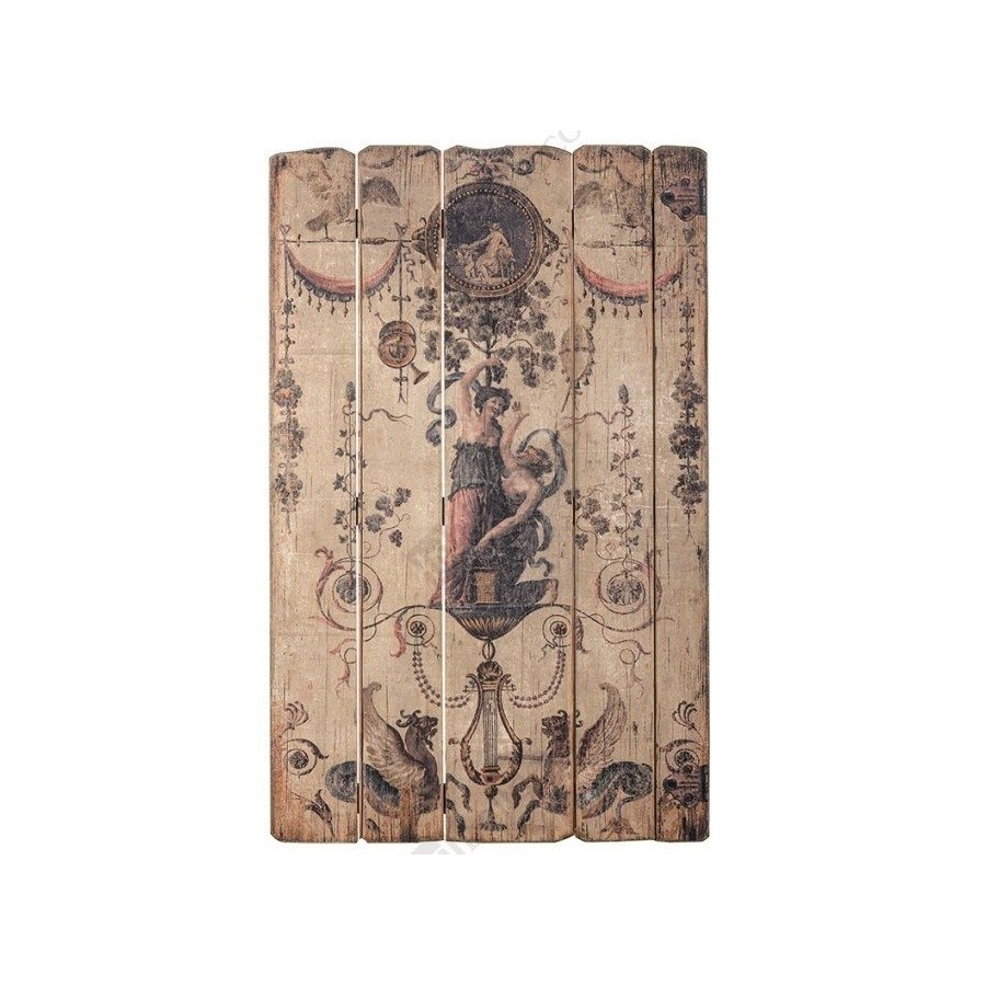 Obraz Belldeco to wąski obraz wykonany na drewnianej desce, przedstawiający szereg elementów, tworzących zgrabną całość. Na obrazie można znaleźć kobiety zrywające winogrona, dwa przepiękne gryfy, cudownie wykończoną lirę, rozłożyste zasłony czy bosko ulokowane, kwieciste motywy roślinne. Gorąco polecamy!