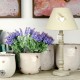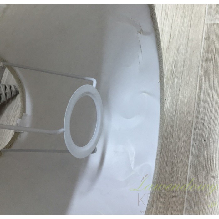 Lampa bielona w stylu prowansalskim z beżowym abażurem wykonanym z lnu.