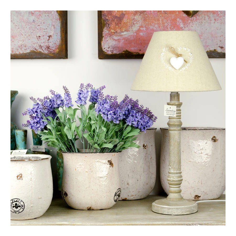 Lampa w stylu prowansalkim o drewnianej, bielonej podstawie. Abażur lampy ma beżowy kolor i jest wykonany z lnu. Po jednej stronie abażura znajduje się drewniane, białe serduszko. Lampa jest idealna do postawienia na komodzie lub stoliku nocnym.